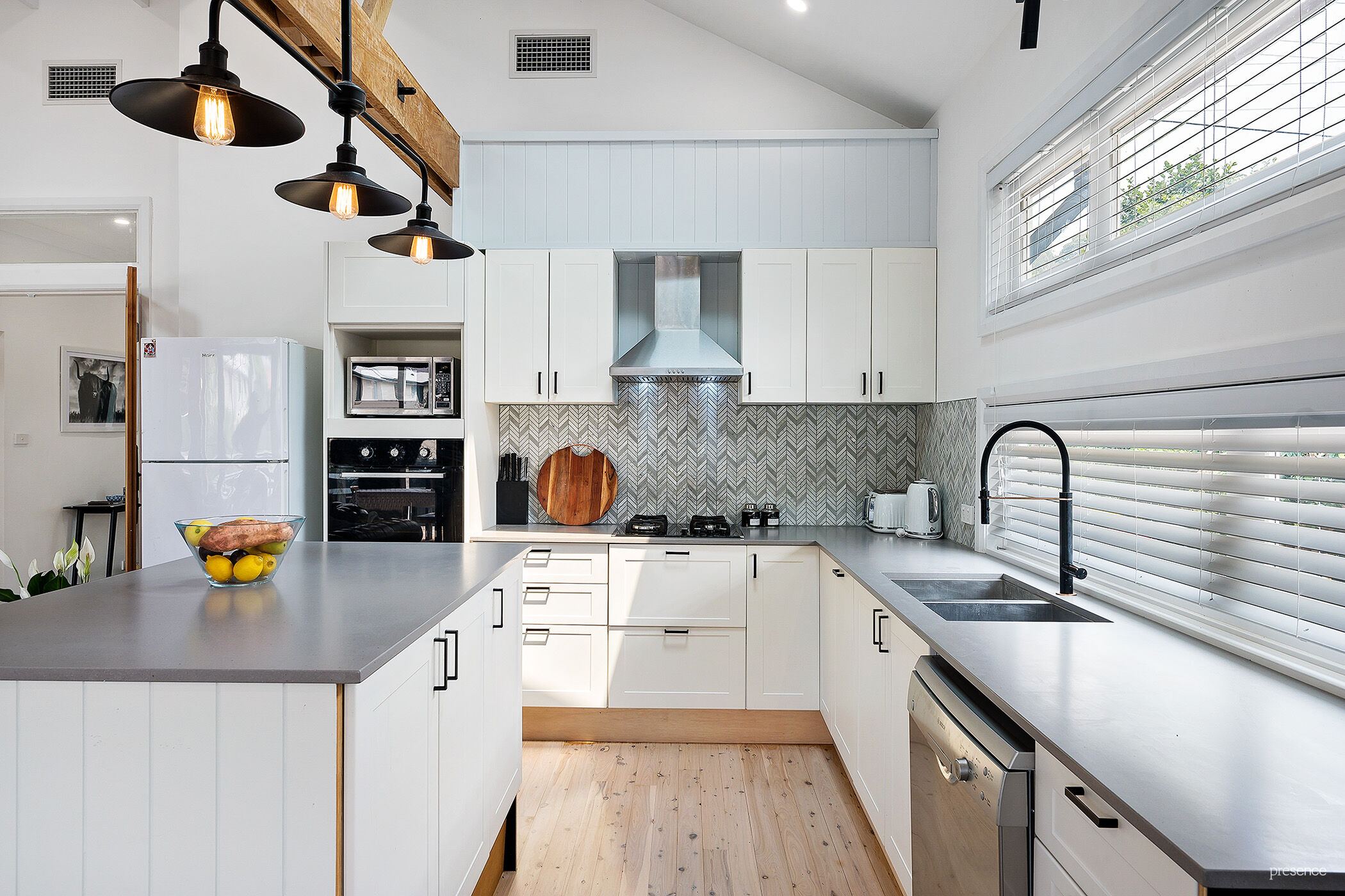 – Impressive kitchen with island bench, feature lighting, dishwasher, gas cooking