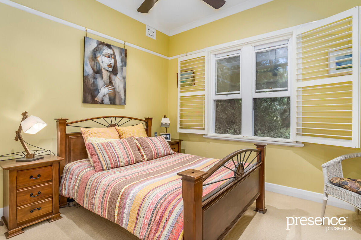 – Master bedroom with ceiling fan, plantation shutters and built in wardrobe