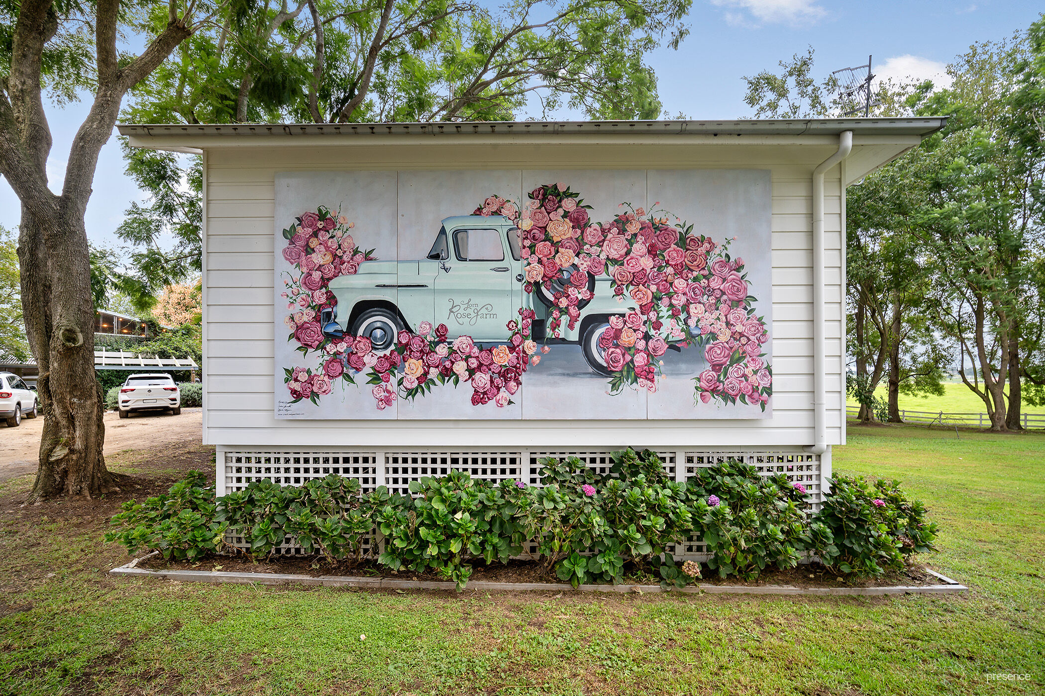 As you approach, be greeted by the charm of a heart-embossed picket fence, delineating your own external space, boasting views across the valley and the meticulously landscaped gardens adorned with fragrant rose beds.