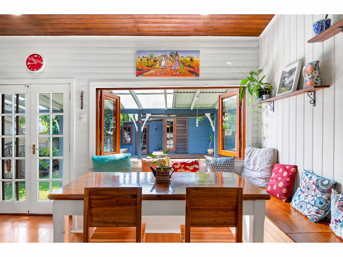 – Dining room features bi-fold windows and under bench seat storage, French doors to the outside