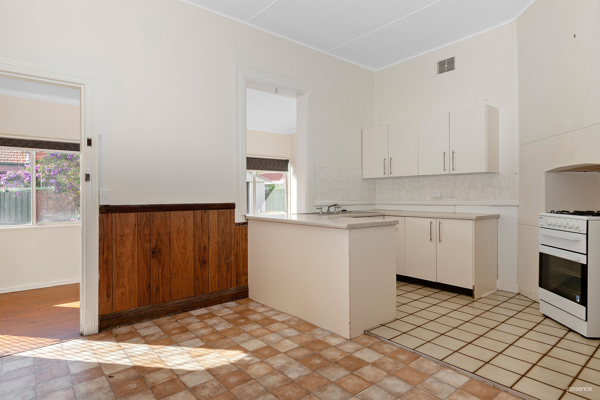 Situated on a perfectly level block, neat hedges line the front of the yard, adding to the street appeal. At the front are 2 large bedrooms, one with ceiling fan. Continue through the hallway and its original stained glass door to find a formal living area and the 3rd bedroom. The property has just had all new fresh carpeting installed. The east-facing sunroom at the back has been enclosed seamlessly to the house for another space to choose as you will – sitting room, home office, playroom, the choice is yours. The functional kitchen has gas cooking and an adjoining dining area. Outside, the wide, welcoming driveway at the side leads to a lock up garage and a neat, flat yard with a beautiful flowering tree up the back. The house is also wheelchair-accessible with ramp entry to the back door and handrails in the shower and toilet.