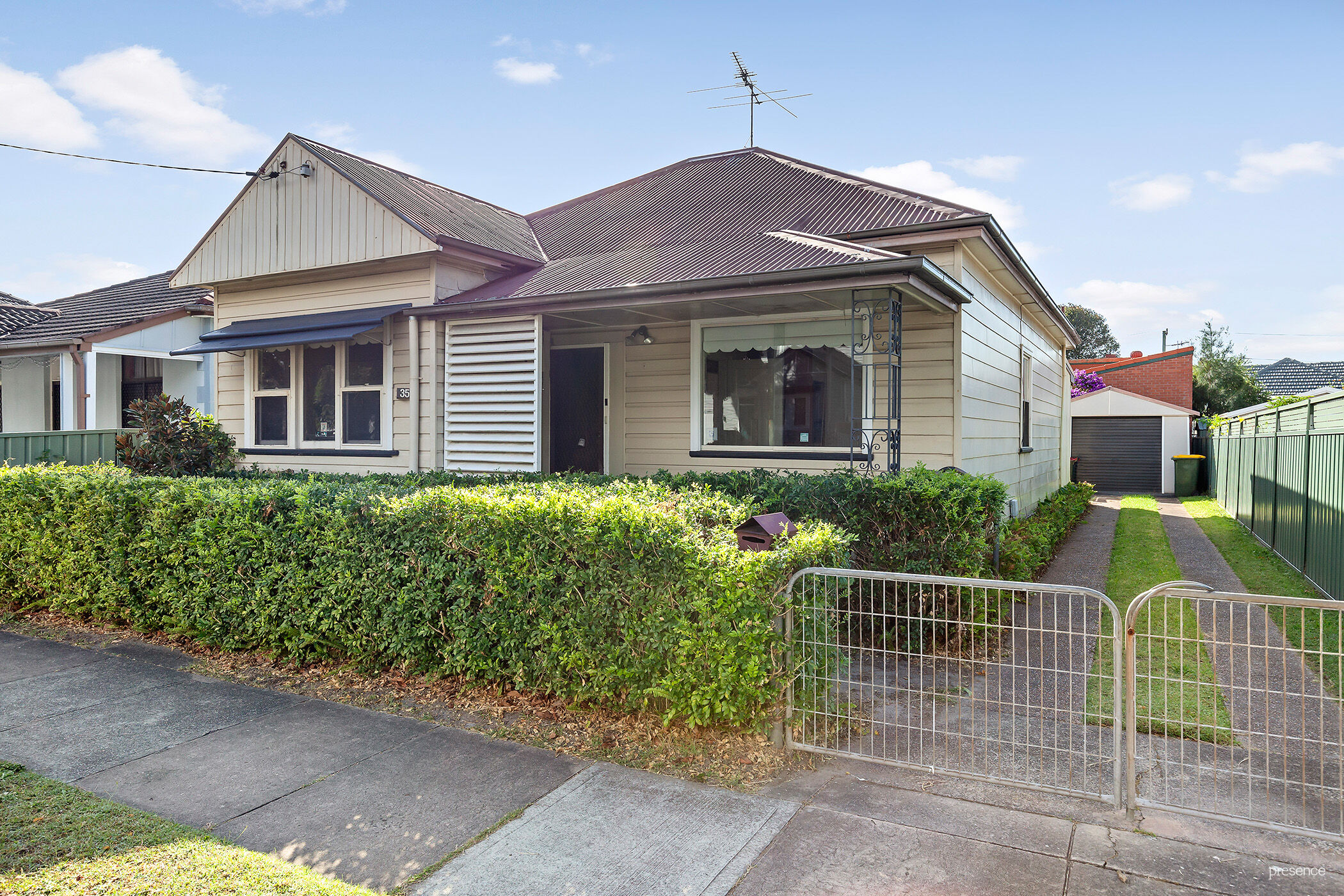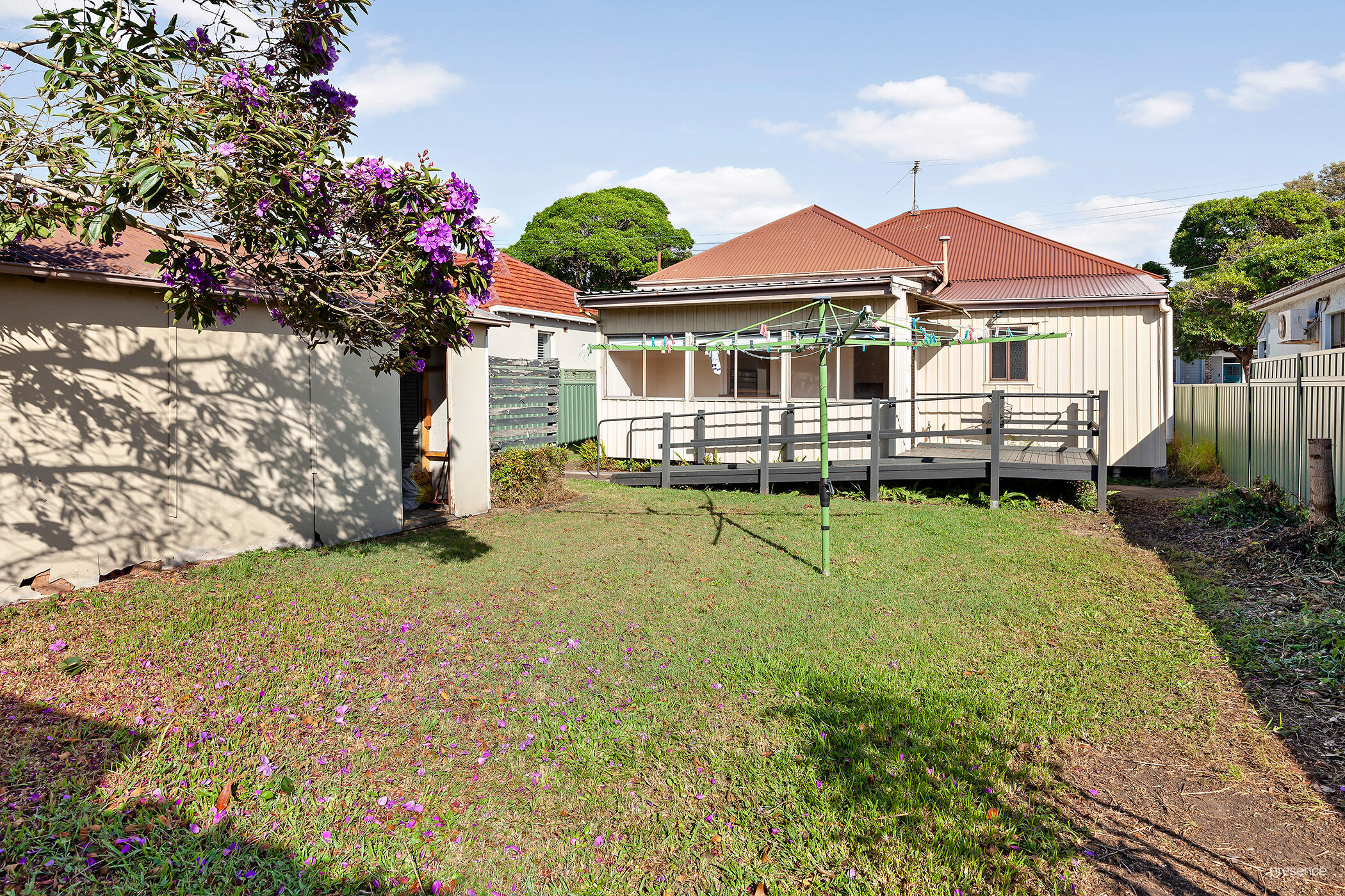 – Level block with neat yard, manicured hedges at the front and flowering tree at the back