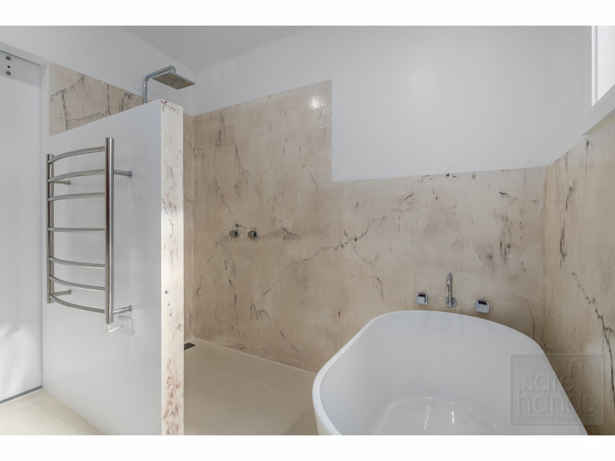 – A bathroom like no other offering feature splash-back and wall treatment, heated towel rail, free standing tub and large walk in shower with no glass to clean