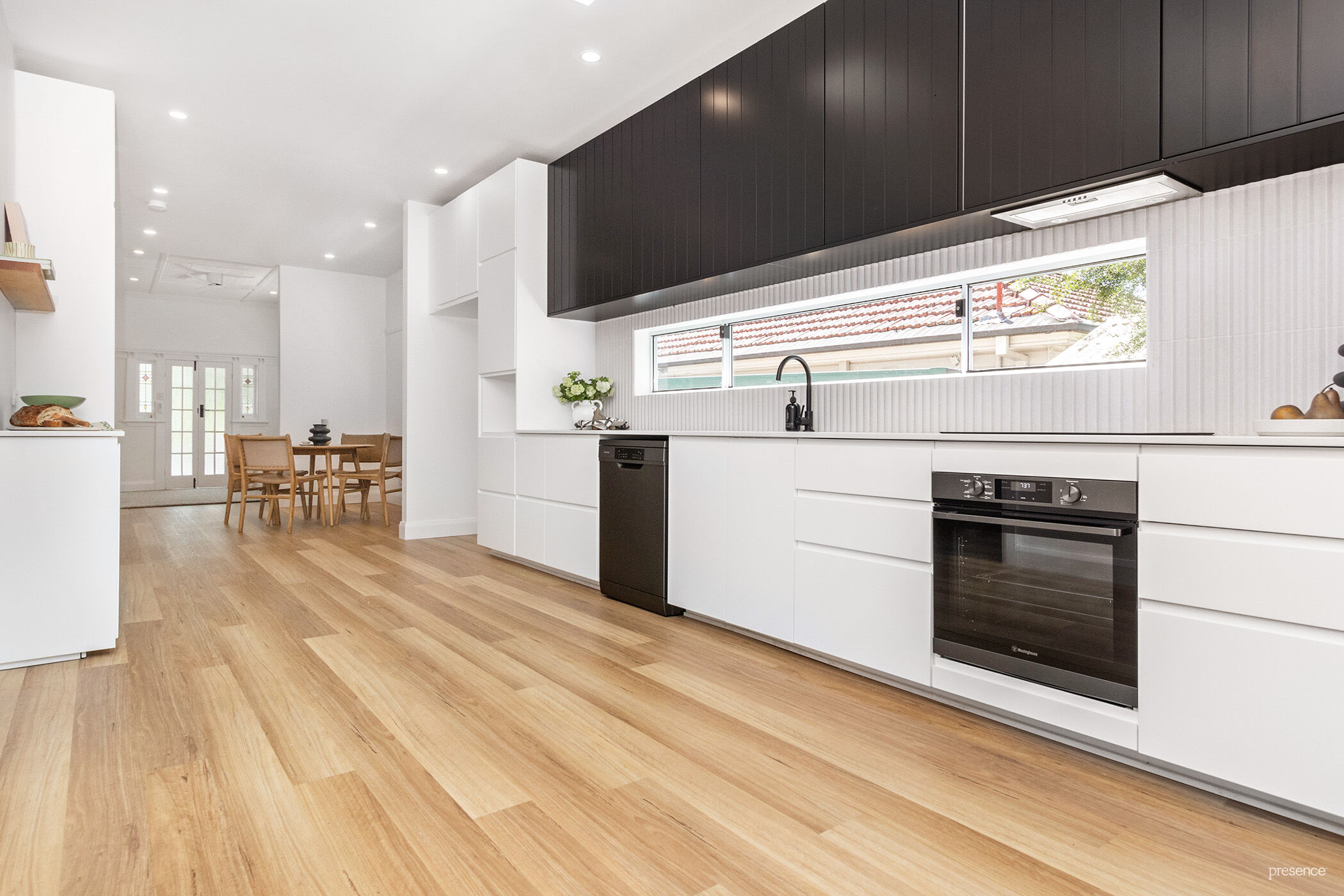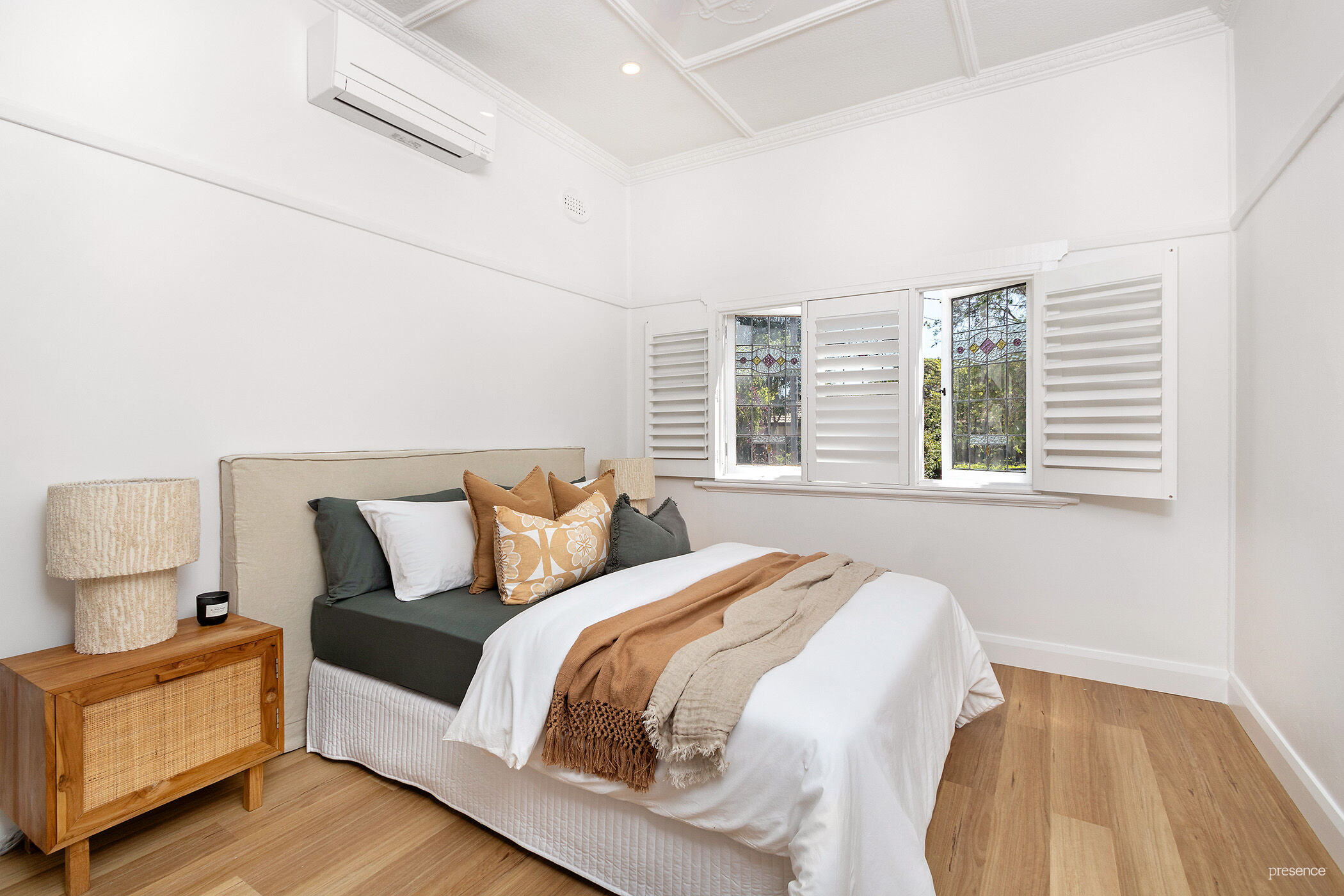 The home offers lovely period features with high patterned ceilings and floating timber floors. The formal lounge room is air-conditioned, has a ceiling fan, ornamental fireplace, and french doors to a shady front veranda. The light and bright dining area leads to the renovated kitchen with a new electric cooktop, oven and dishwasher, flowing onto the covered alfresco entertaining area and outdoor laundry.