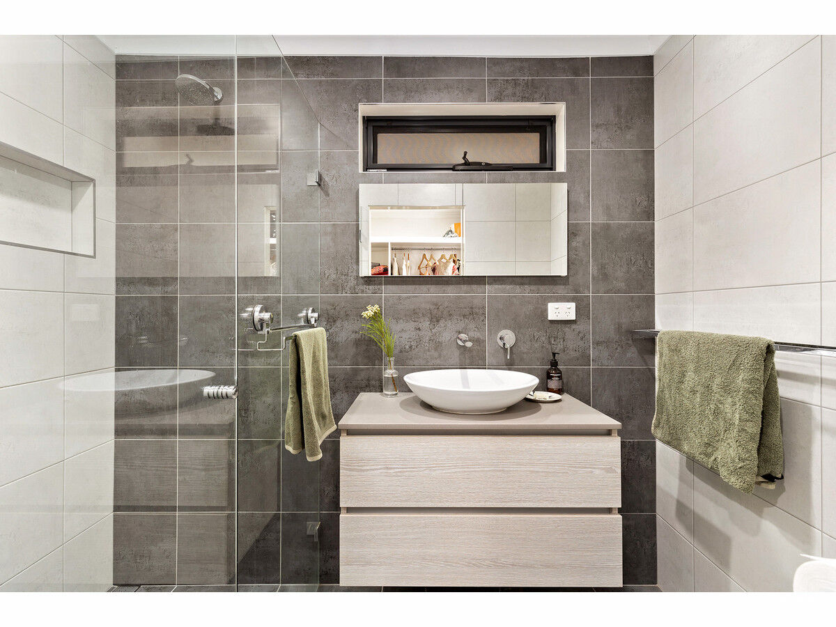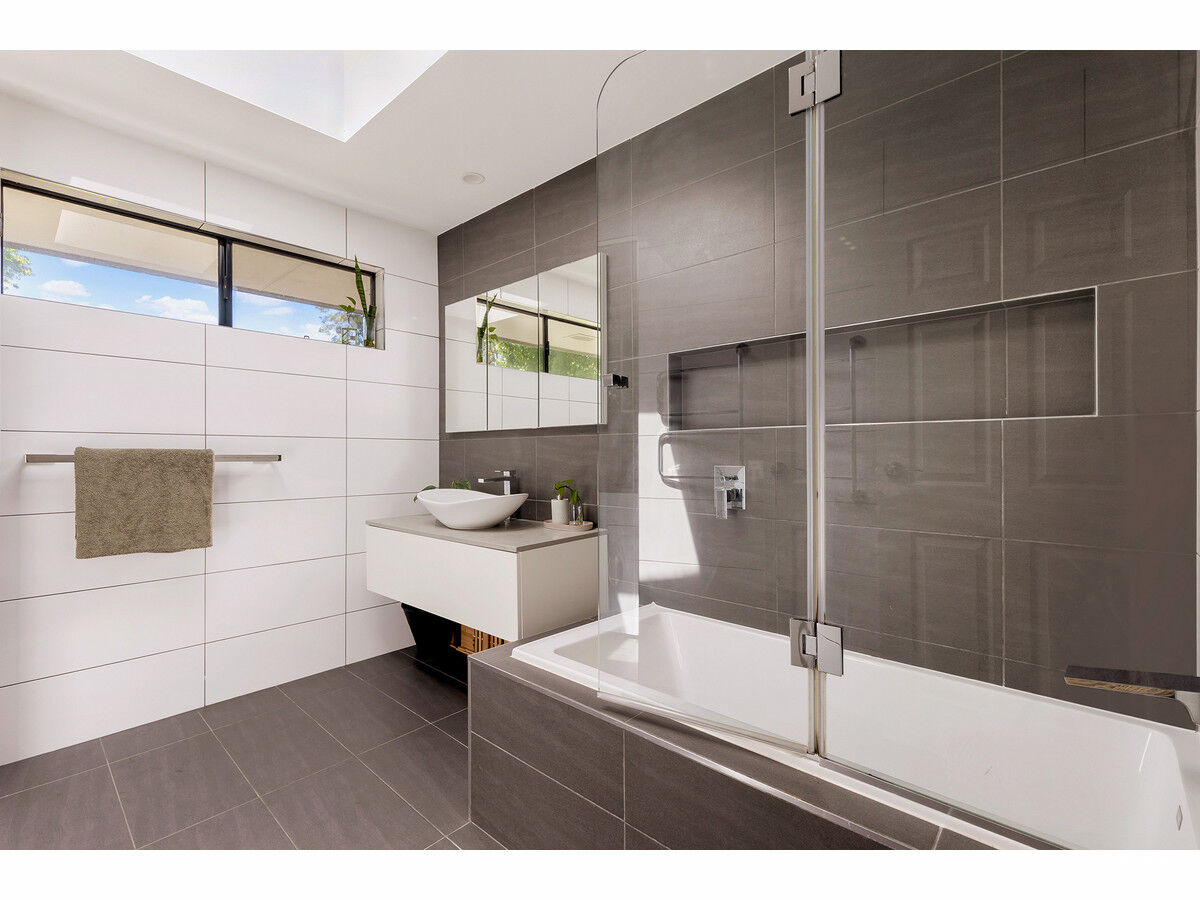 – Sleek contemporary bathrooms with floating timber and stone vanities, luxe, oversized floor to ceiling tiles and large built in tub