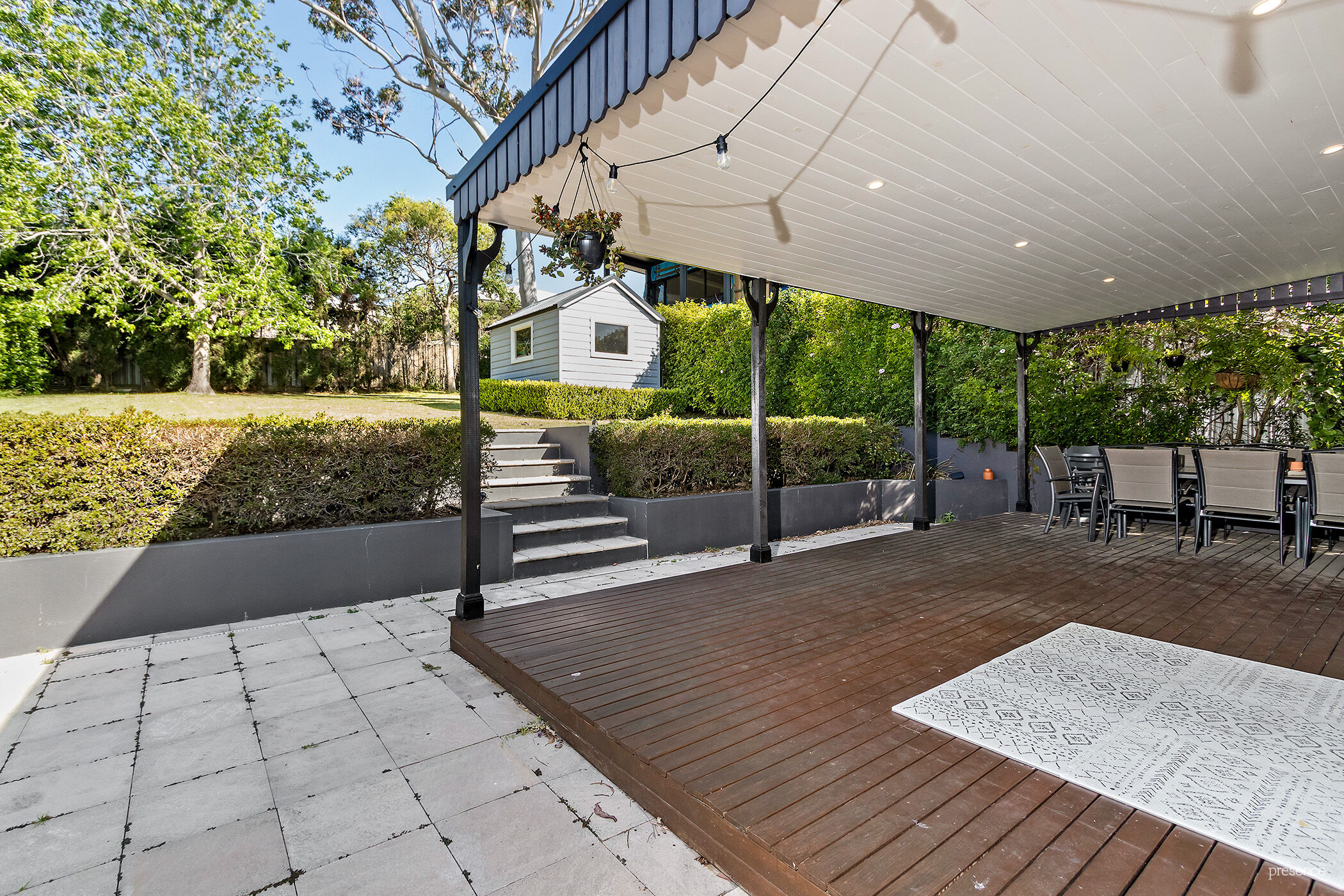 A modern kitchen with quality appliances opens to the main dining space, which easily flows out the spacious light filled main living area. From here you will find the expansive covered entertainment space perfectly framed by the manicured gardens and lawns offering a bespoke garden shed and long paved area leading to the front.