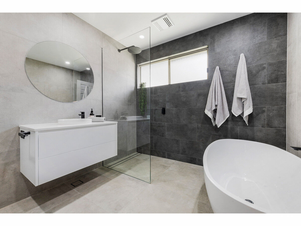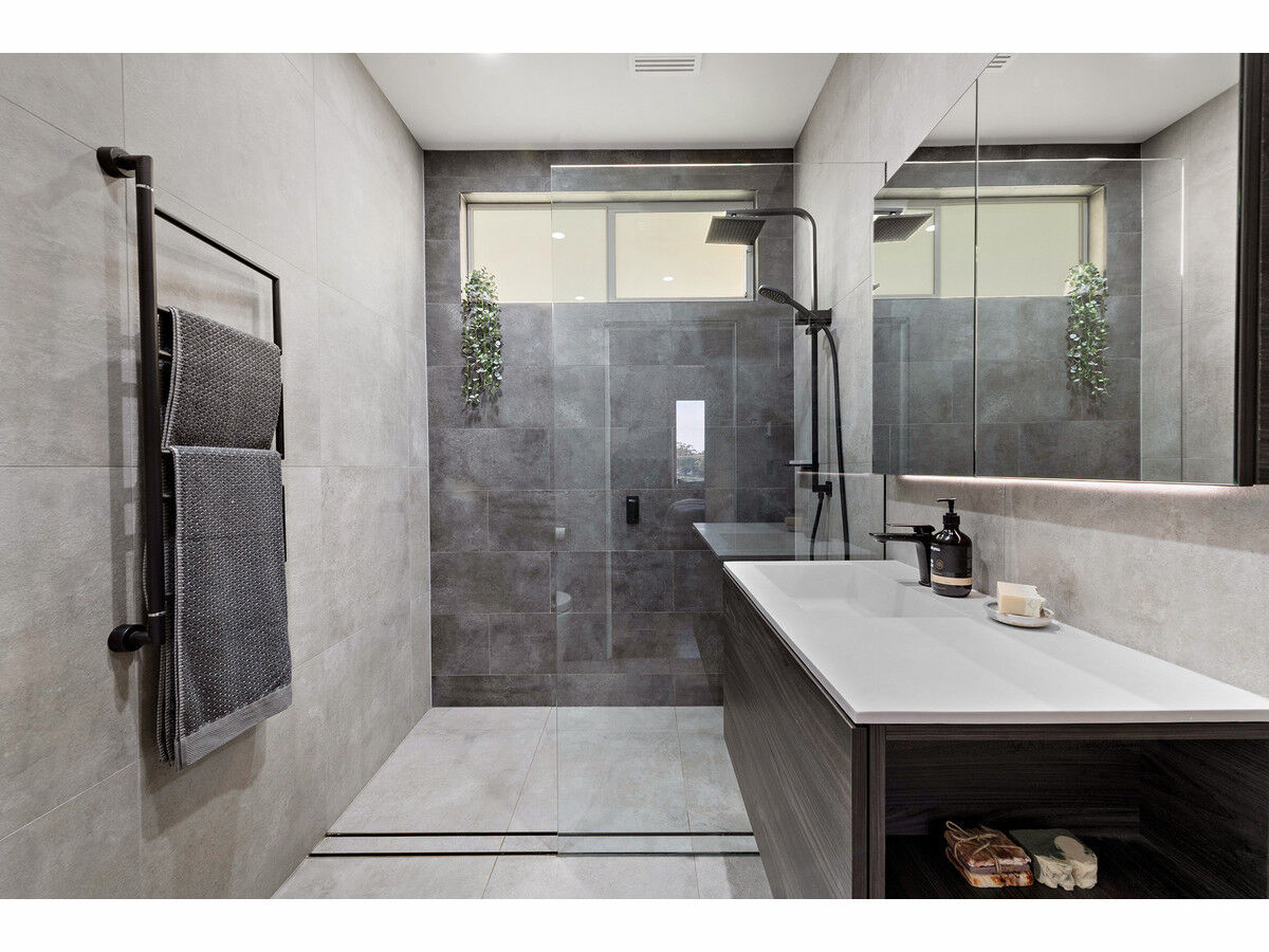 – Two designer bathrooms fully tiled with black tapware, walk-in showers and underfloor heating, upstairs bathroom features a free-standing bath and the downstairs bathroom a heated towel rail
