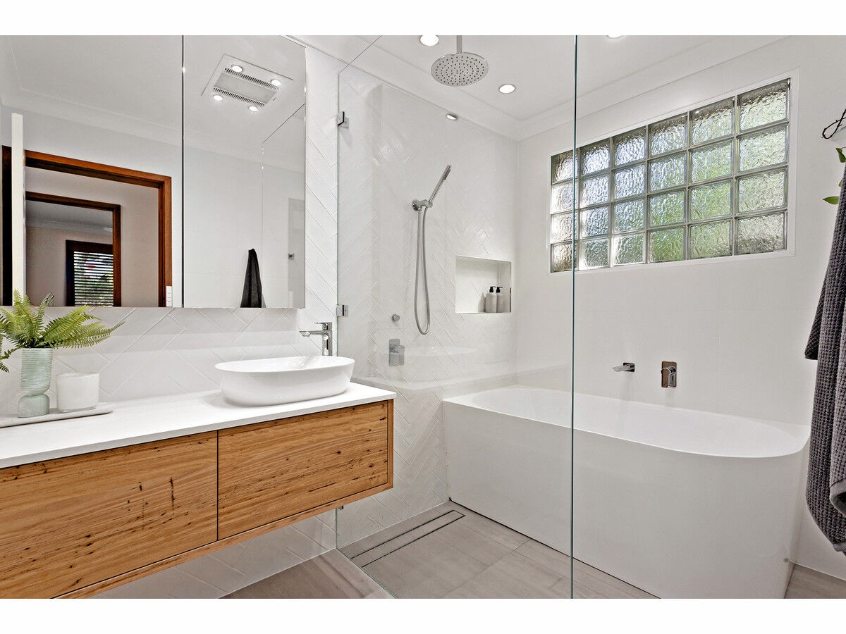 – Two bathrooms include an elegant main bathroom featuring a deep bath, separate shower with twin showerheads, floating vanity, and separate toilet, as well as a practical two-way ensuite off the master bedroom.