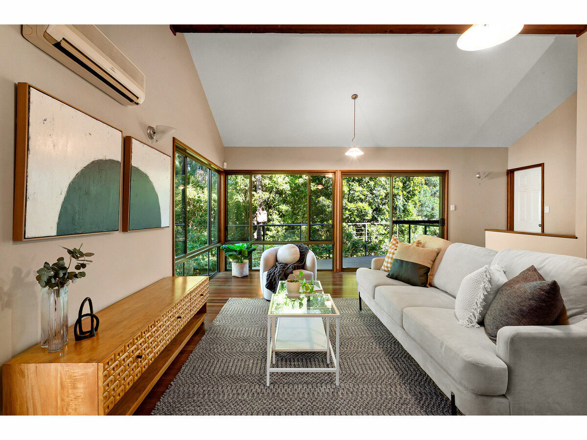 Soaring cathedral ceilings on both levels increase this home’s sense of space and aesthetic appeal, and its wide windows bring the leafy surroundings in. Wherever you choose to relax in the liberal selection of seating areas, you will enjoy the overall sense of calm and serenity. An outdoor patio, generous swathe of level lawn, and multiple levels of balconies promote outdoor enjoyment and easy entertaining. Bonus inclusions comprise air-conditioning, solar panels, a double garage with remote opener, separate workshop, and handy rainwater tank.