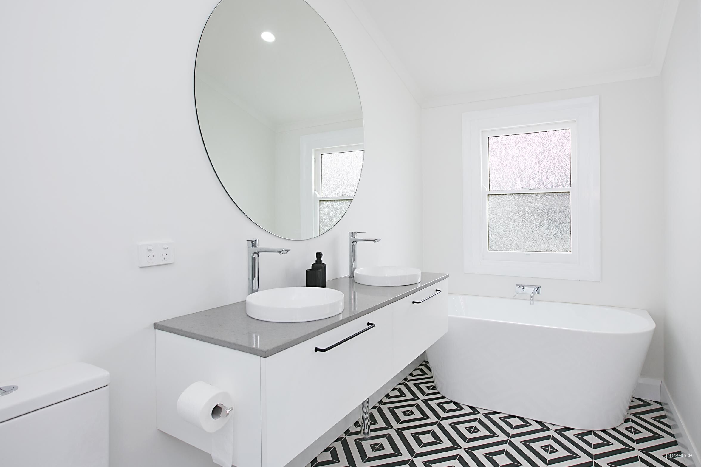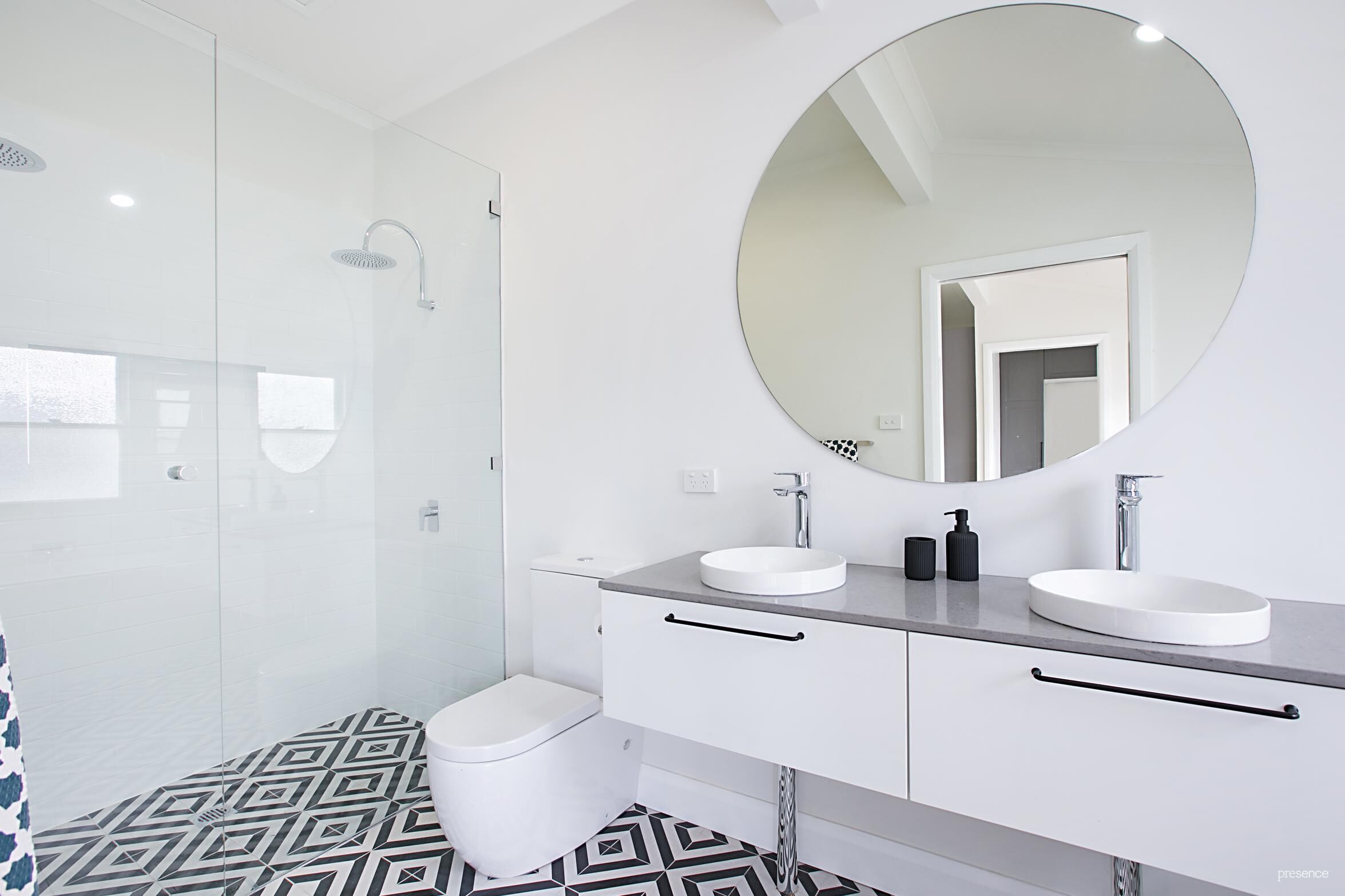 – Family bathroom with double shower, Caesarstone double vanity and deep bath