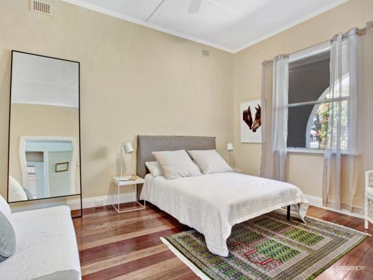 The home is enhanced by the natural warmth of timber floors and high ceilings across three generously proportioned bedrooms and an air-conditioned central lounge room. The kitchen (and laundry) feature stone benchtops and european cooking appliances, while mealtime comes with the choice of eating in the north facing dining zone or outside on the sunny deck. Both bathrooms exhibit the results of chic renovations with inspired details that include a double shower, large bathtub, on-trend tiling and plenty of natural light.