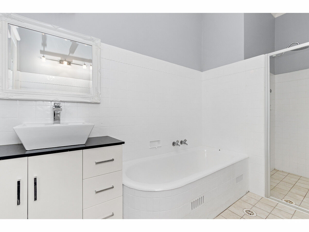– Updated art-deco bathroom with sleek vanity, full bath, and curved shower recess