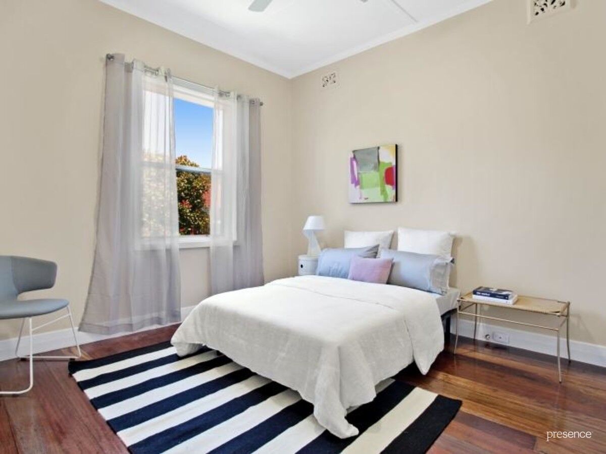 The home is enhanced with the natural warmth of the timber floors and high ceilings that span across three generously proportioned bedrooms and an air-conditioned central lounge room. The kitchen features stone benchtops and European cooking appliances and the internal laundry also features stone benchtops. Both bathrooms exhibit the results of chic renovations with inspired details that include a double shower, large bathtub and on-trend tiling and plenty of natural light and airflow.