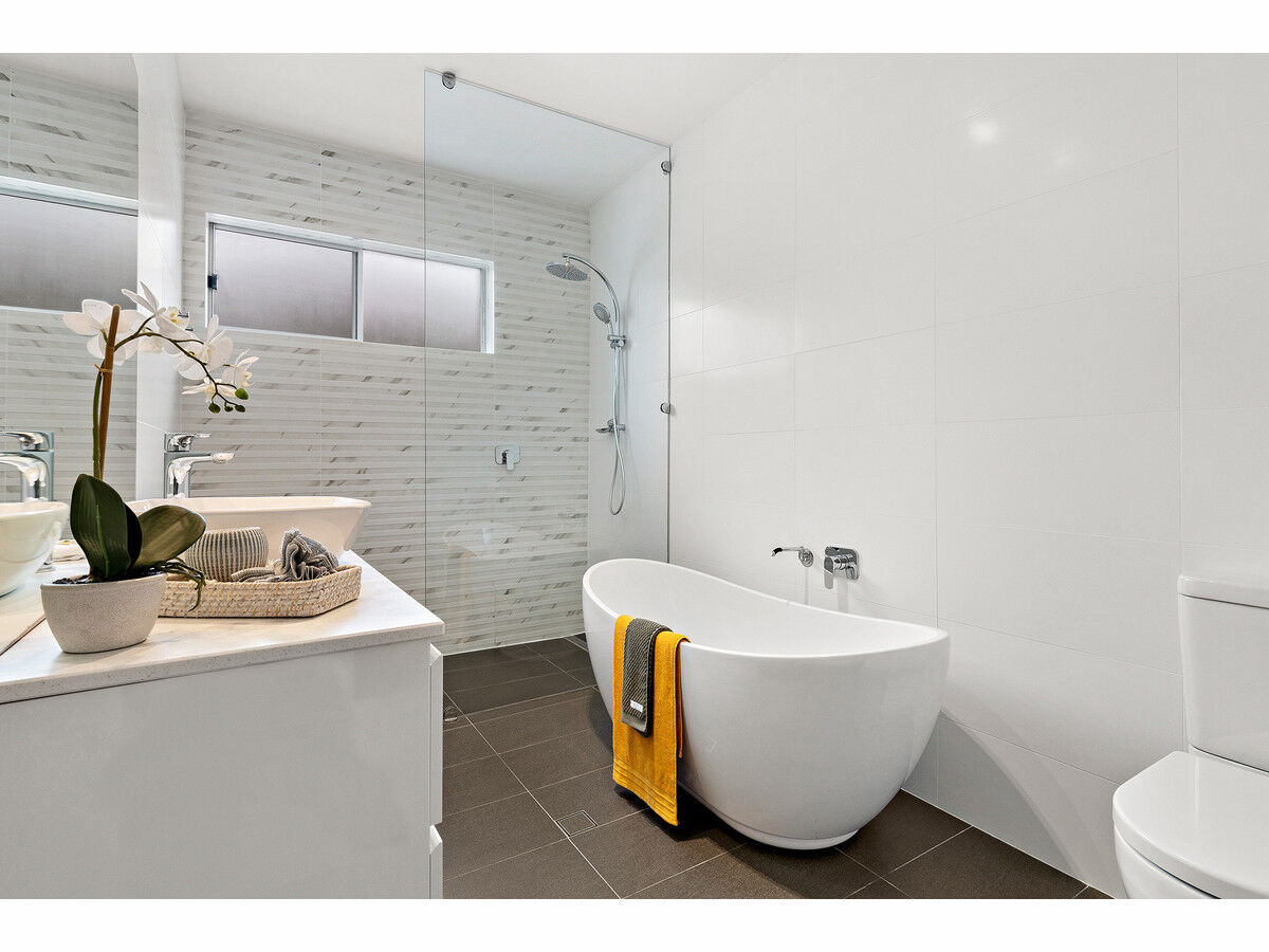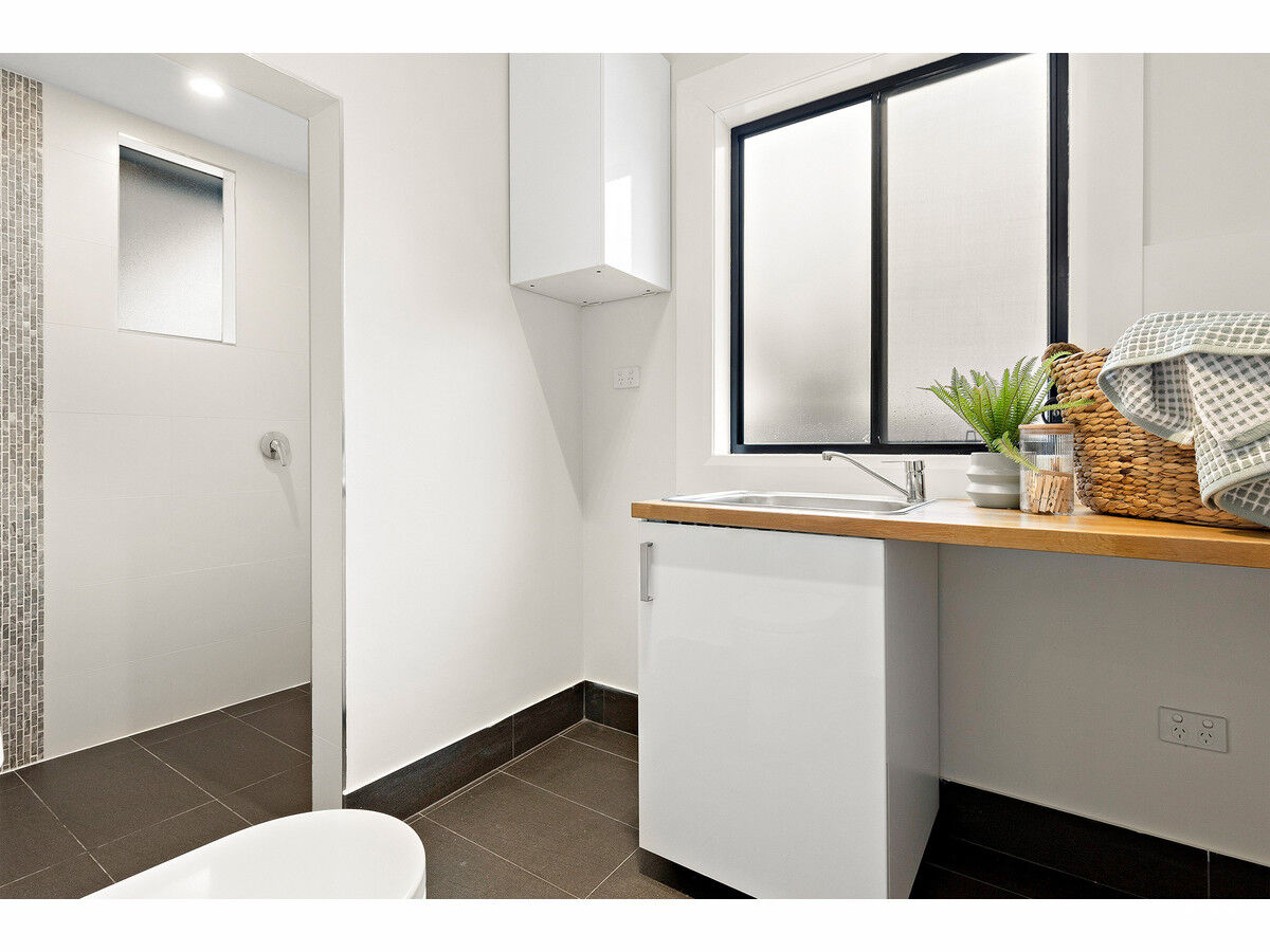 In the open-plan living area, you’ll find a stylish Caesarstone kitchen equipped with stone benches and gas cooking. Glass sliding doors lead seamlessly to the rear deck, perfect for entertaining guests or relaxing with your morning coffee. The main bathroom is a true oasis, complete with a stunning freestanding bath, frameless glass shower, and full-height tiling. The laundry even features a second w/c and shower for added convenience. With ducted air conditioning keeping things comfortable all year round, this home truly has it all.