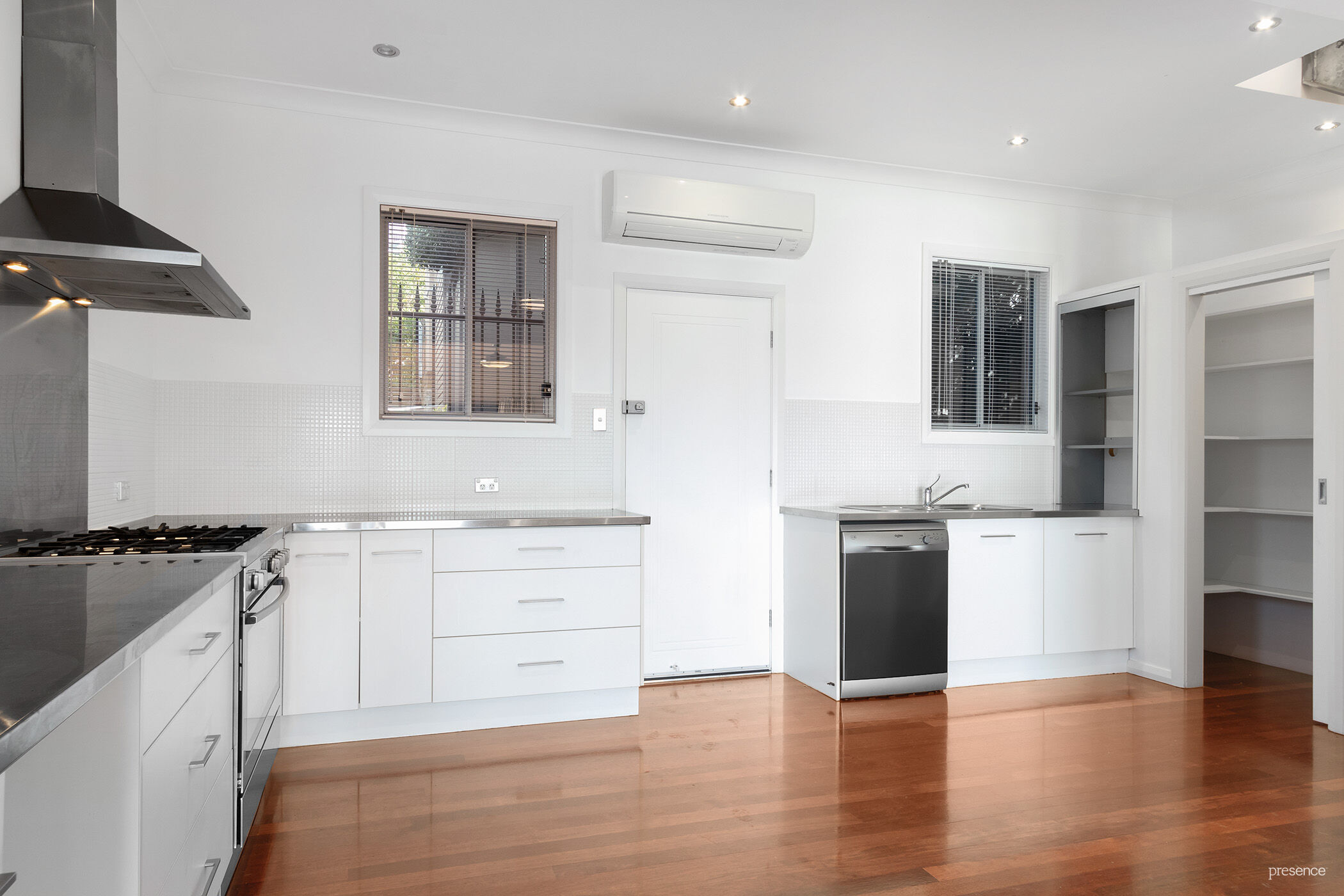 – Sleek industrial kitchen with large gas range, dishwasher and walk in pantry come appliance cupboard