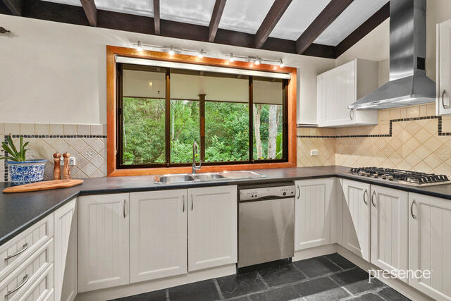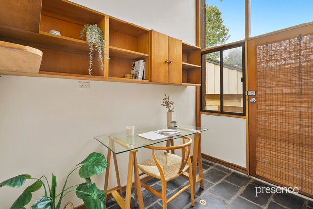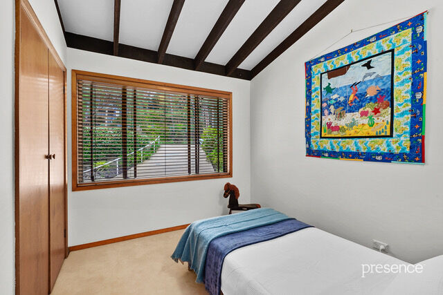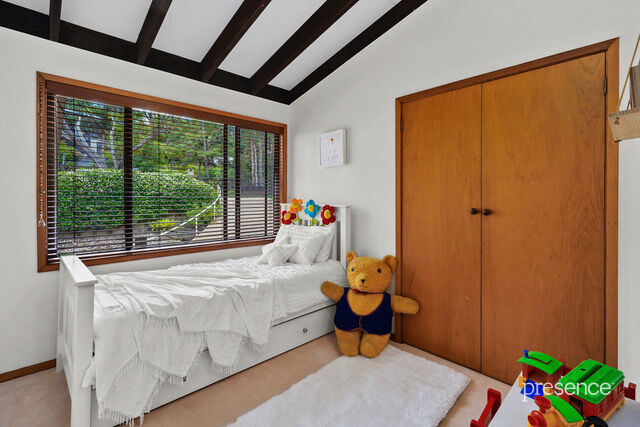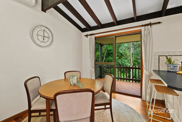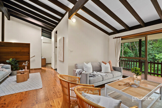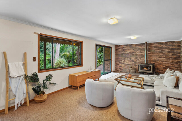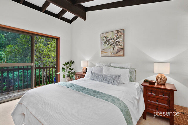 The home’s dual split-level design is rich in architectural charm, featuring high raked ceilings with exposed beams, raw brick walls, and polished timber floors, all warmed by a wood combustion heater during the cooler months. Large windows and glass sliding doors invite the lush greenery of the reserve inside, creating a home that is both comfortable and inviting.