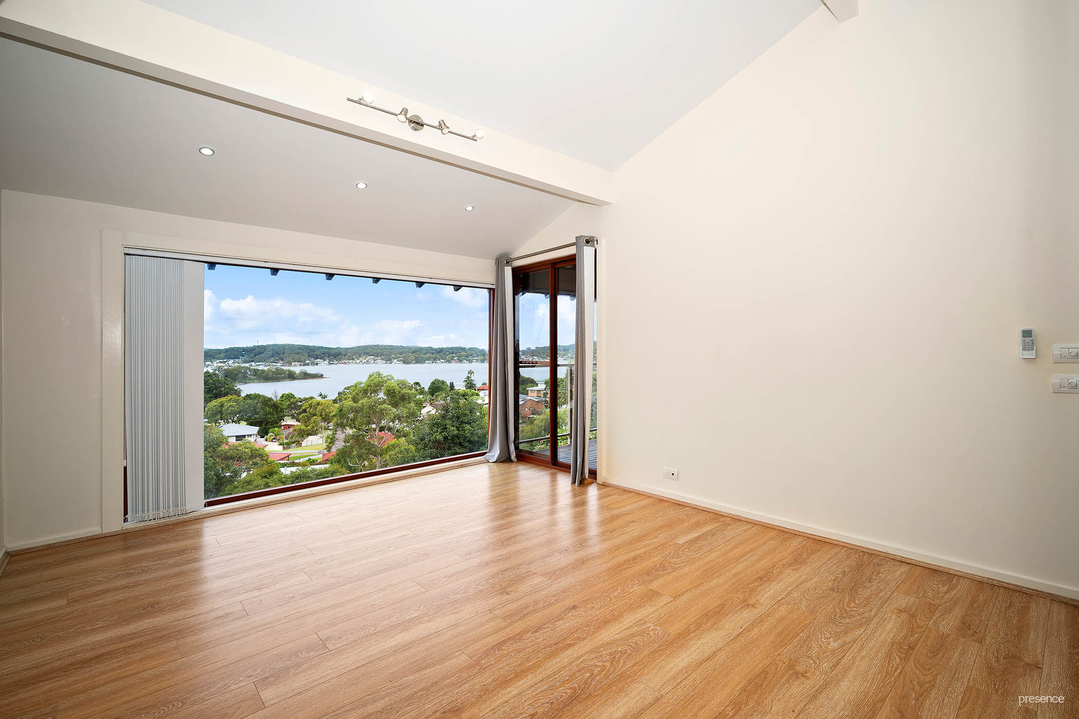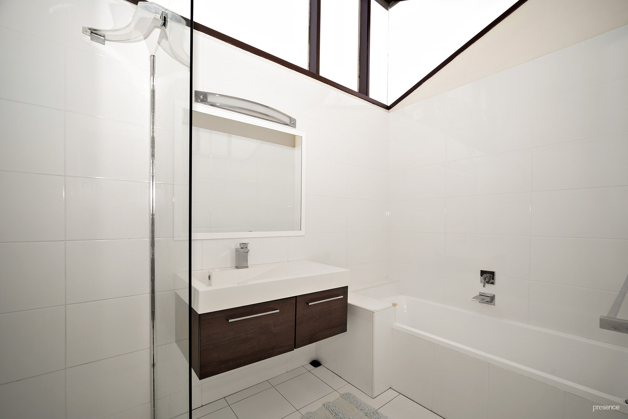 The upper level is dedicated to the master suite, a private retreat featuring a ceiling fan, air conditioning, built-in wardrobe, and ensuite. Sliding doors open onto a deck, where you can wake up to stunning lake views. Bedrooms 2 and 3 both include built-in wardrobes, with Bedroom 3 also boasting air conditioning and serene water vistas. A well-appointed main bathroom, complete with a full-sized bathtub and abundant natural light, services this level.