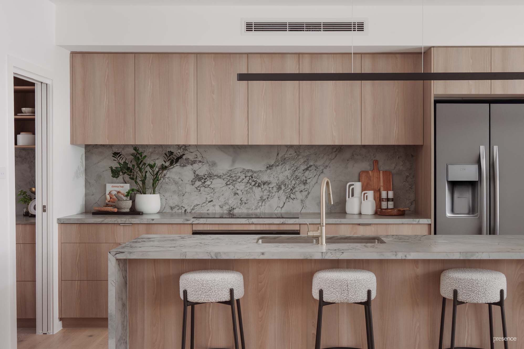 • Designer kitchen featuring Super White Ibrido quartz benchtops and Fisher & Paykel appliances