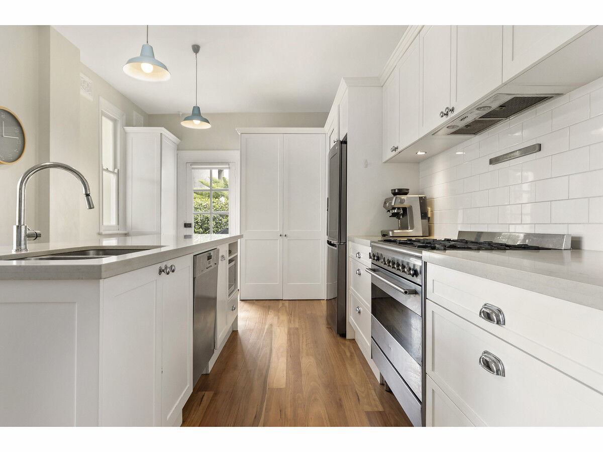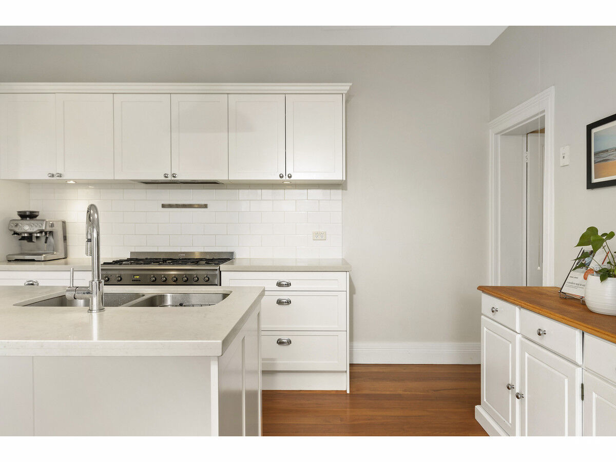 Elevated on The Hill capturing harbour views from the upper level lacework balcony, the tastefully updated two-storey home offers family-sized living with four spacious bedrooms, including one on ground floor that could be an extra living space or home office, plus three bathrooms. Adjoining lounge and dining rooms can function as one free-flowing space or separated via cavity sliding doors. The contemporary island kitchen, featuring stone benches and gas cooking, seamlessly connects to a wonderfully private garden and deck through glass sliders, complete with an eclipse roof. This delightful spot beckons you throughout the day, whether it’s for your morning cuppa, lunch with the kids, or entertaining friends—it’s simply perfect.