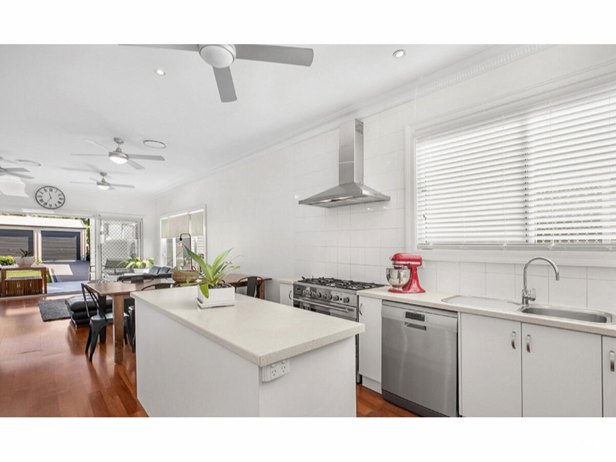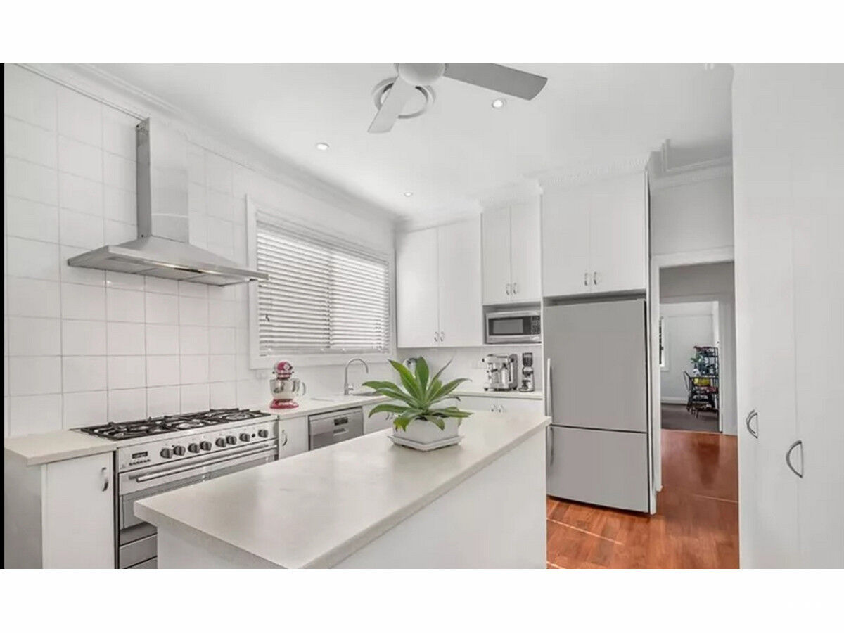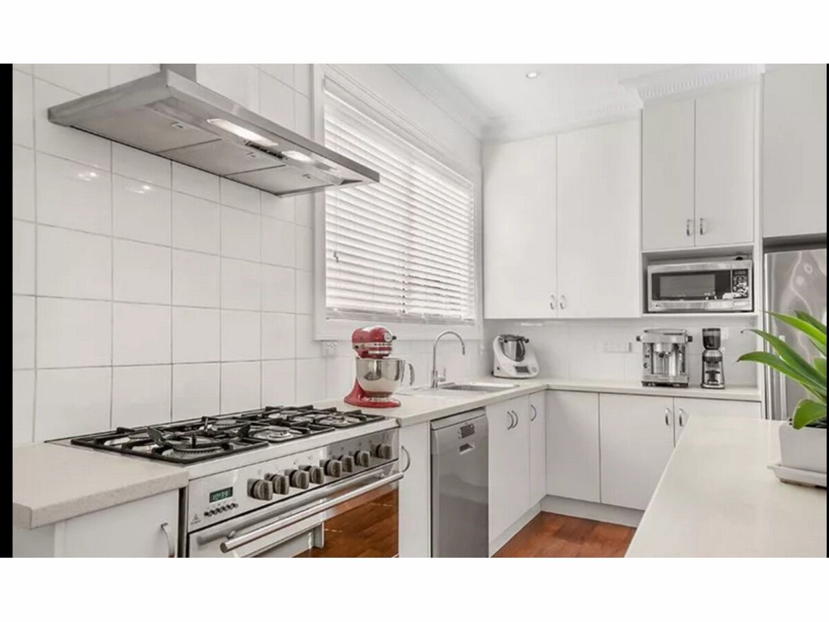 – Stunning kitchen with island bench and stainless steel appliances with gas cooktop