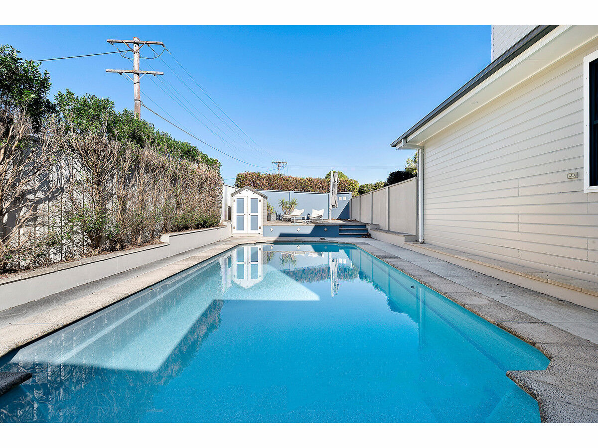 A spacious, open-plan living area seamlessly combines the kitchen, dining, and lounge where expansive windows, strategically placed skylights and glass doors flood the room with natural light, bringing the outside in and enhancing the sense of space and connection. In the hub of the home is the glossy white kitchen, fitted with premium appliances, Caesarstone benchtops, a Miele dishwasher and ample storage. From here, the indoor living zone spills out onto a resort-style alfresco deck, setting the stage for epic parties. It is equipped with practical aluminium shutters for year-round comfort and provides dual access to the sparkling pool and lush lawn – a paradise for kids and pets to run about while adults mingle, sharing tall stories and laughter.