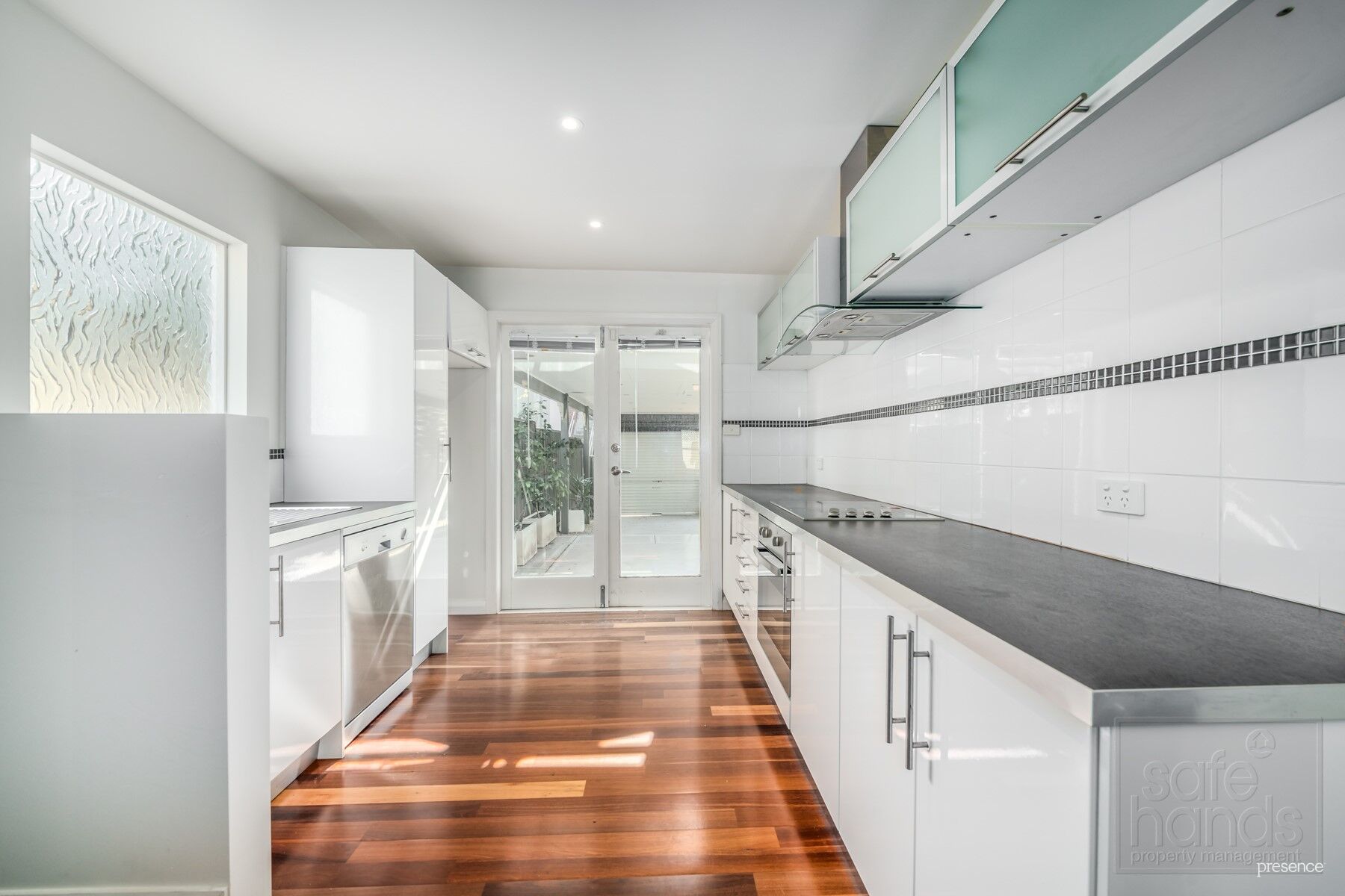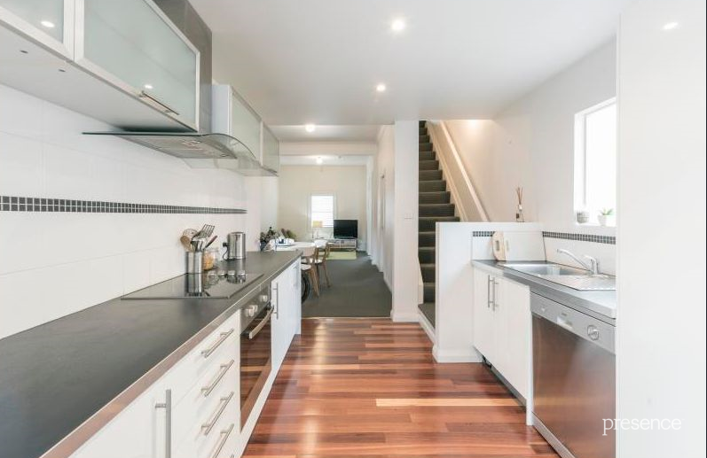 The modern galley style kitchen comes with stainless steel appliances, plenty of cupboards for storage, the floating floor boards are a complimentary finish to the kitchen and design to the home. One of the features and appeal of the property is the two french doors that lead off the kitchen onto a courtyard which has been well designed for a outdoor space, the courtyard offers established plants and planter boxes which are easy care. Great area if you have a green thumb!