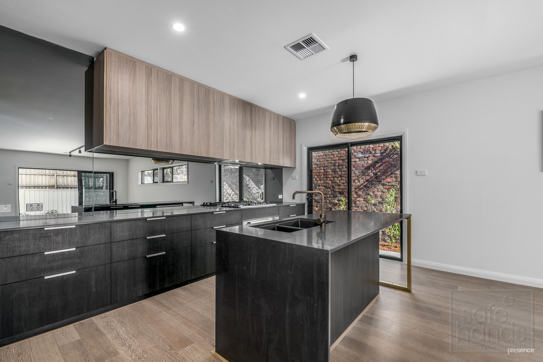 – Sleek and stylish kitchen with over-sized gas cook top and oven, black sink, dishwasher, large pantry and bench-space all topped off with smoky glass spalsh-back and feature pendant