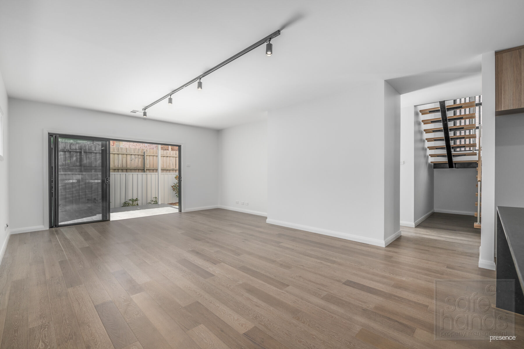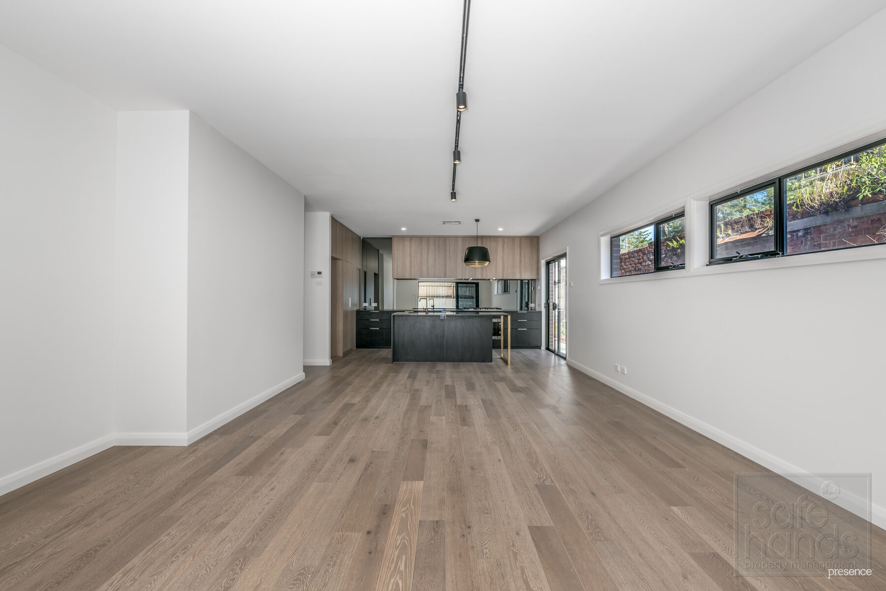 – Open plan lounge, dining and kitchen, with modern black track light, easy care flooring and a/c
