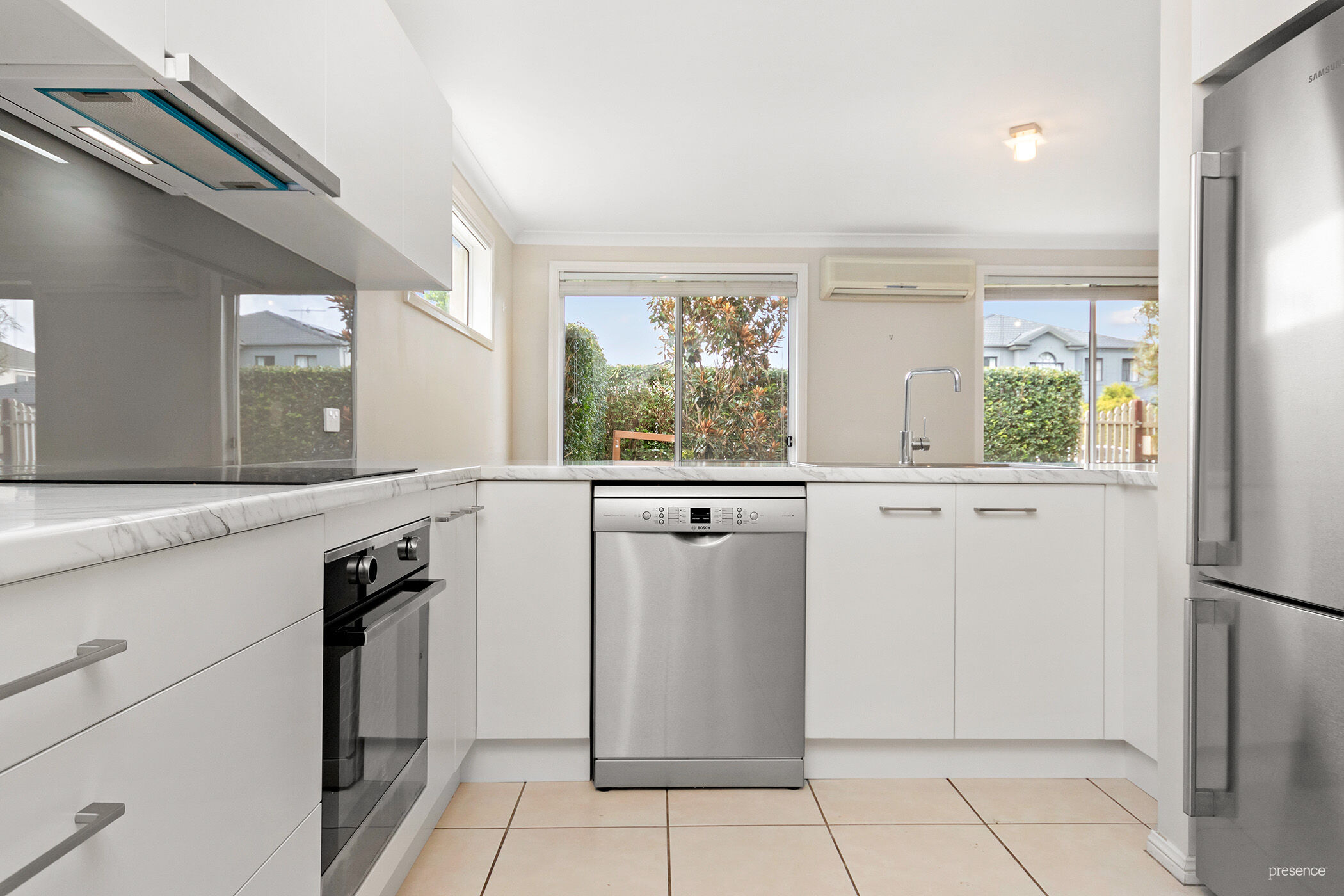 The modern kitchen features electric cooking and dishwasher with ample cupboard space and a stainless fridge included.