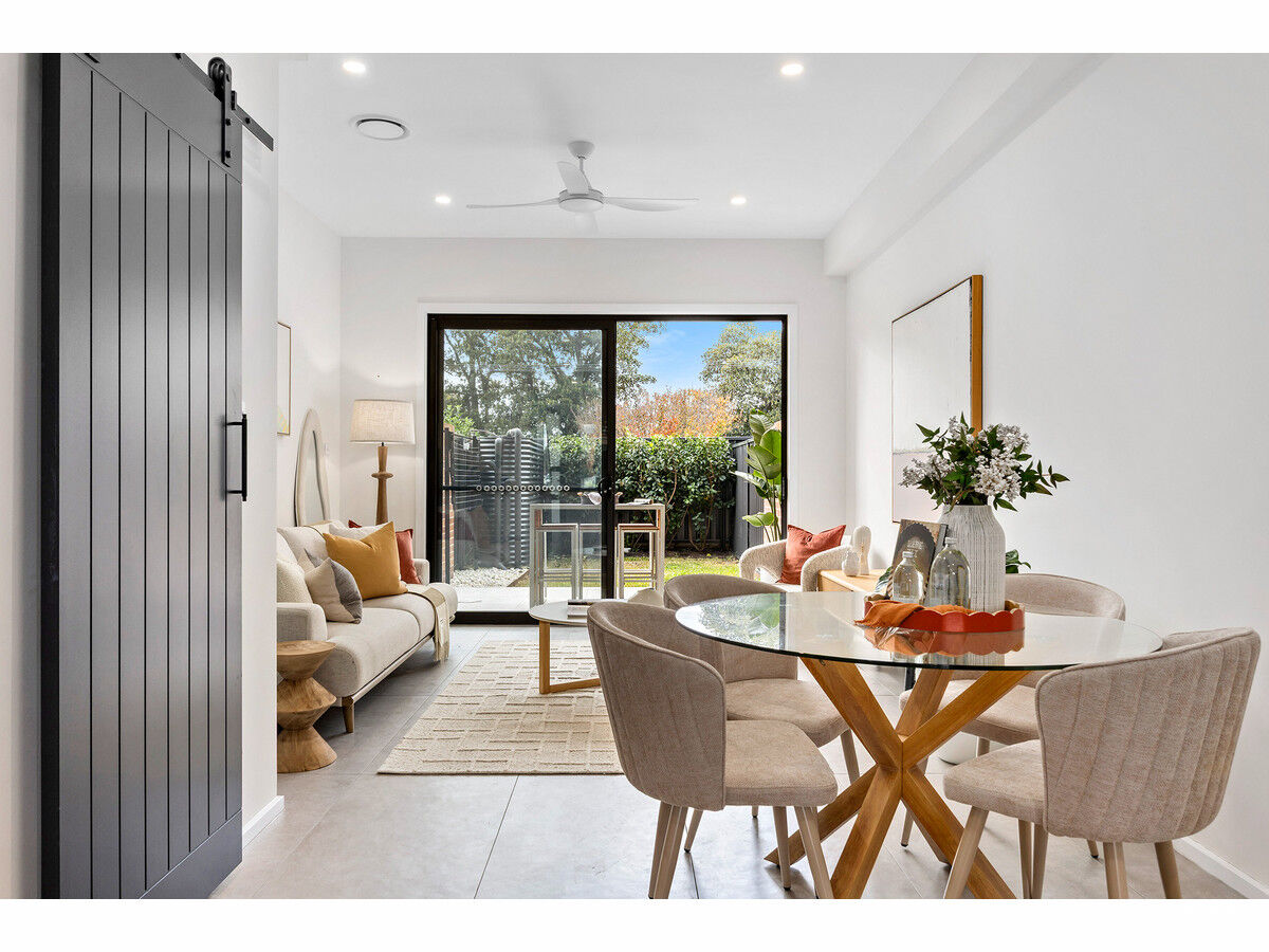 The sleek designer kitchen features matte black cabinetry, timber accents, a stone-topped island, induction cooktop, wall oven, and dishwasher. The open-plan living and dining areas are drenched in sunlight and framed by leafy park views. Sliding glass doors open onto a tiled alfresco area and private lawn—an inviting space for entertaining or simply unwinding in your own urban sanctuary.