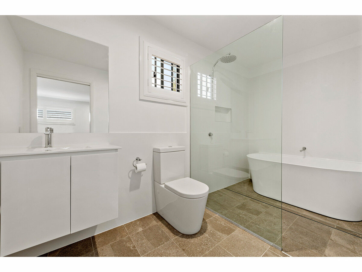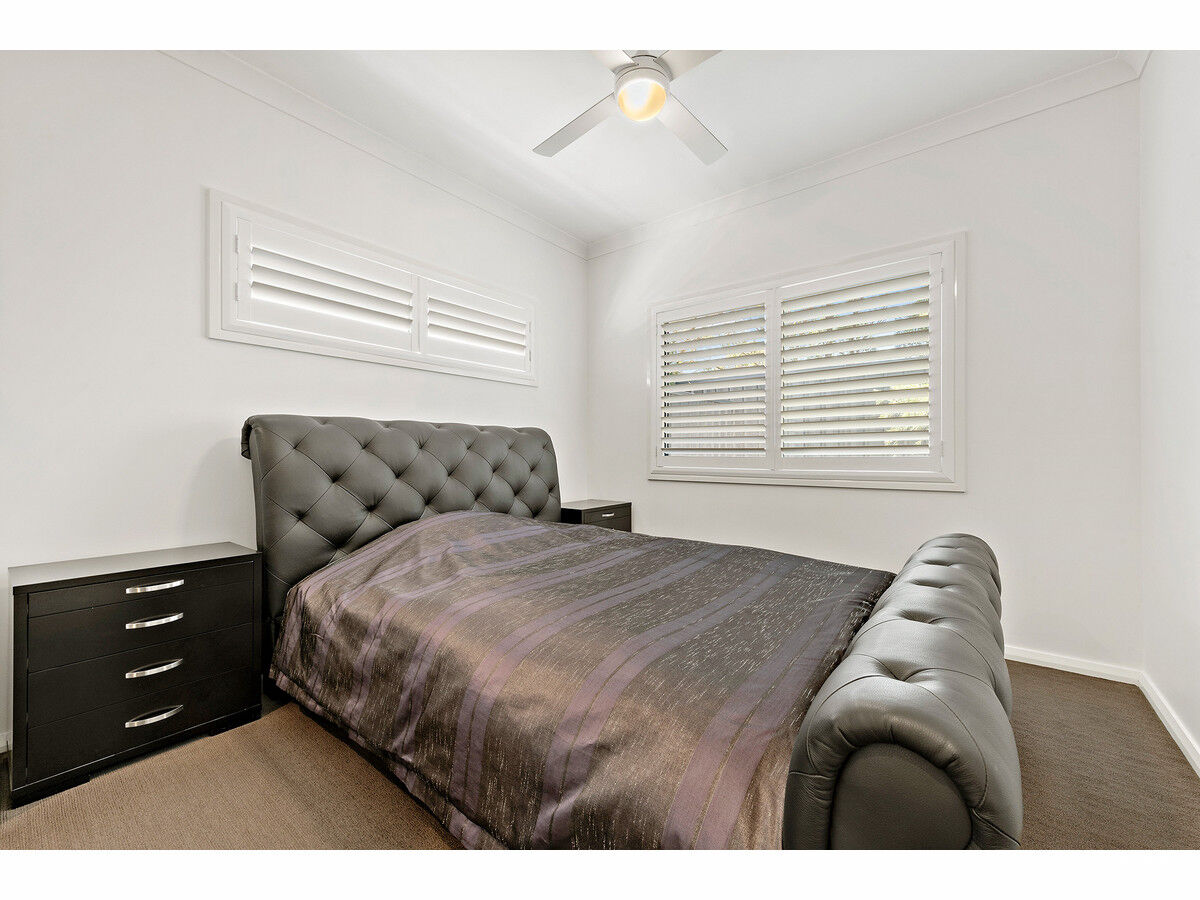 The master bedroom suite is located off the living area and is generously sized, with two windows featuring classy shutter blinds, a walk-through wardrobe with plenty of storage space and a spacious, modern ensuite. A true retreat from the rest of the home, this space is calming and relaxing with all the contemporary conveniences a recent build could offer. The two other bedrooms are located on the first floor of the property, both with the same gorgeous shutter blinds, fresh carpets, and roomy built-in wardrobes. These upstairs bedrooms are separated by a secondary living space complete with more built-in storage, and a huge family style bathroom with a massive stand-alone bathtub and modern overhead shower.