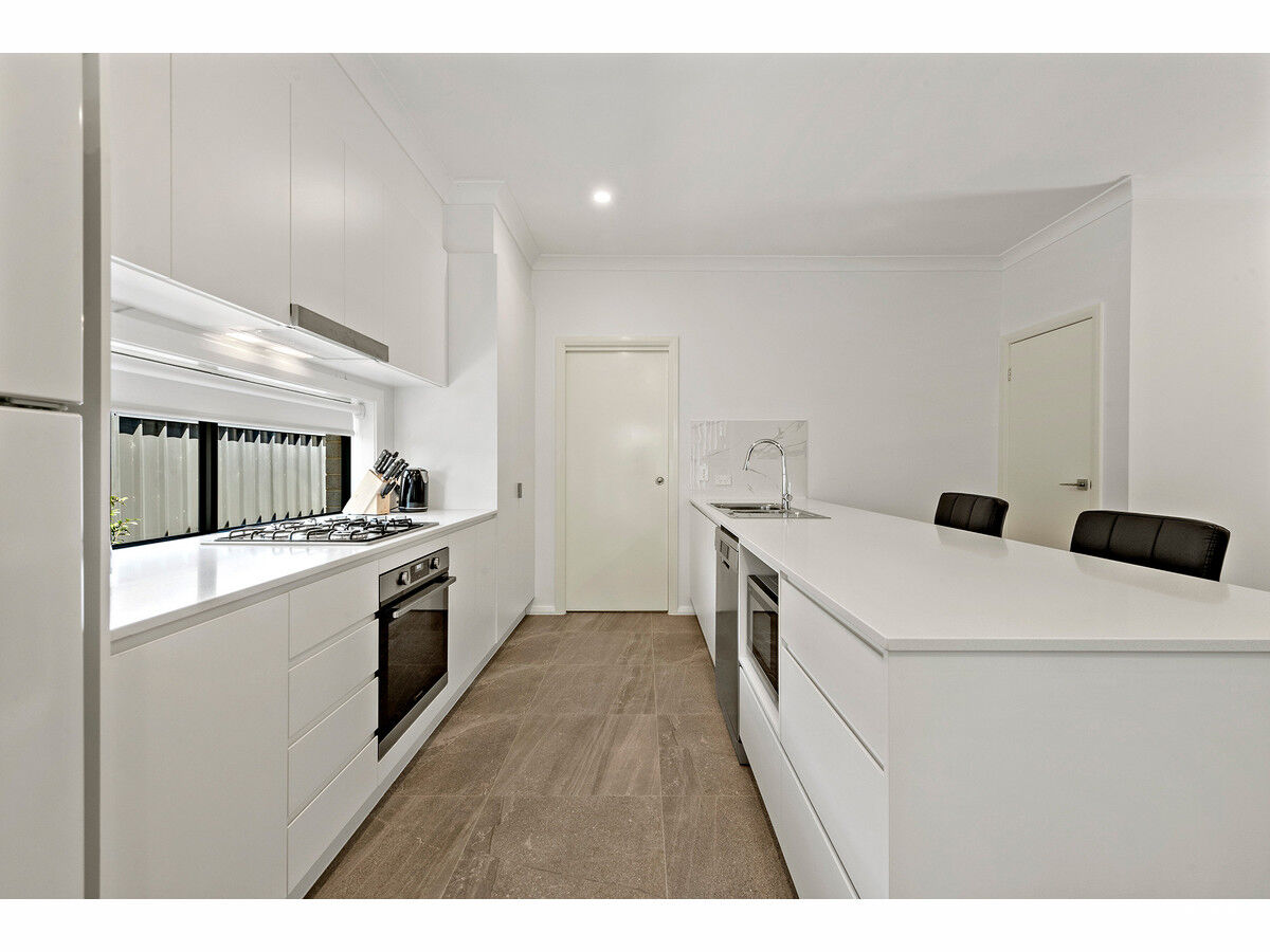 One of 13 properties in this complex, with each townhouse being designed to capitalise specifically on privacy between homes, you’ll feel as if you’re on your very own block. Boasting a beautiful modern take on a brick exterior, with low maintenance garden beds greeting you as you walk in, the aesthetic of this home is contemporary, paired-back and clean. A white kitchen island with a stainless-steel sink mirrors the light-washed kitchen countertops, complete with gas top stove and stainless-steel dishwasher. Ample windows and large sliding doors in the living area portion of the area ensures the space is filled with natural light and beckons you out to the surprisingly spacious backyard. With plenty of room for outdoor entertaining, low maintenance, established garden beds and well-maintained lawns, you aren’t compromising on the ability to have indoor/outdoor spaces in this townhouse.