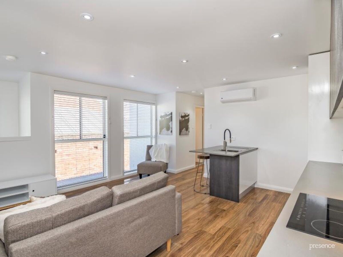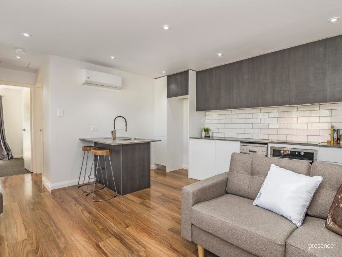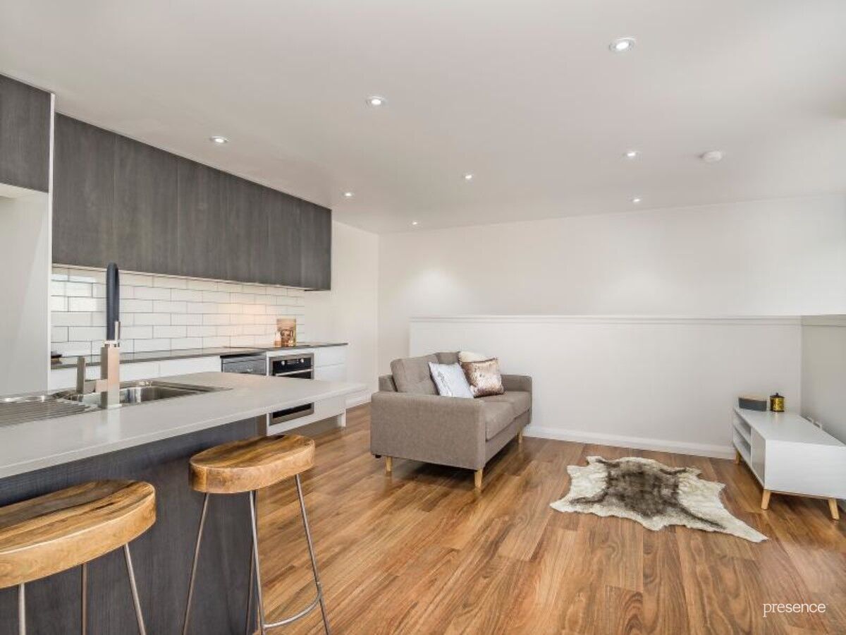 A crisp, neutral colour palette and floating timber floors instantly sets the tone of laid-back sophistication with an open plan layout showcasing on-trend high quality appointments. A sleek kitchen with Caesarstone benches, electric cooking appliances and subway tiling, while the fully tiled bathroom features matte black tapware and a stone-topped vanity. Two double bedrooms connect to a balcony for effortless relaxation.