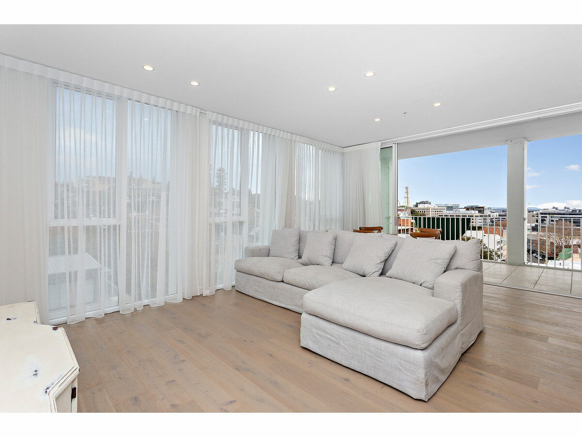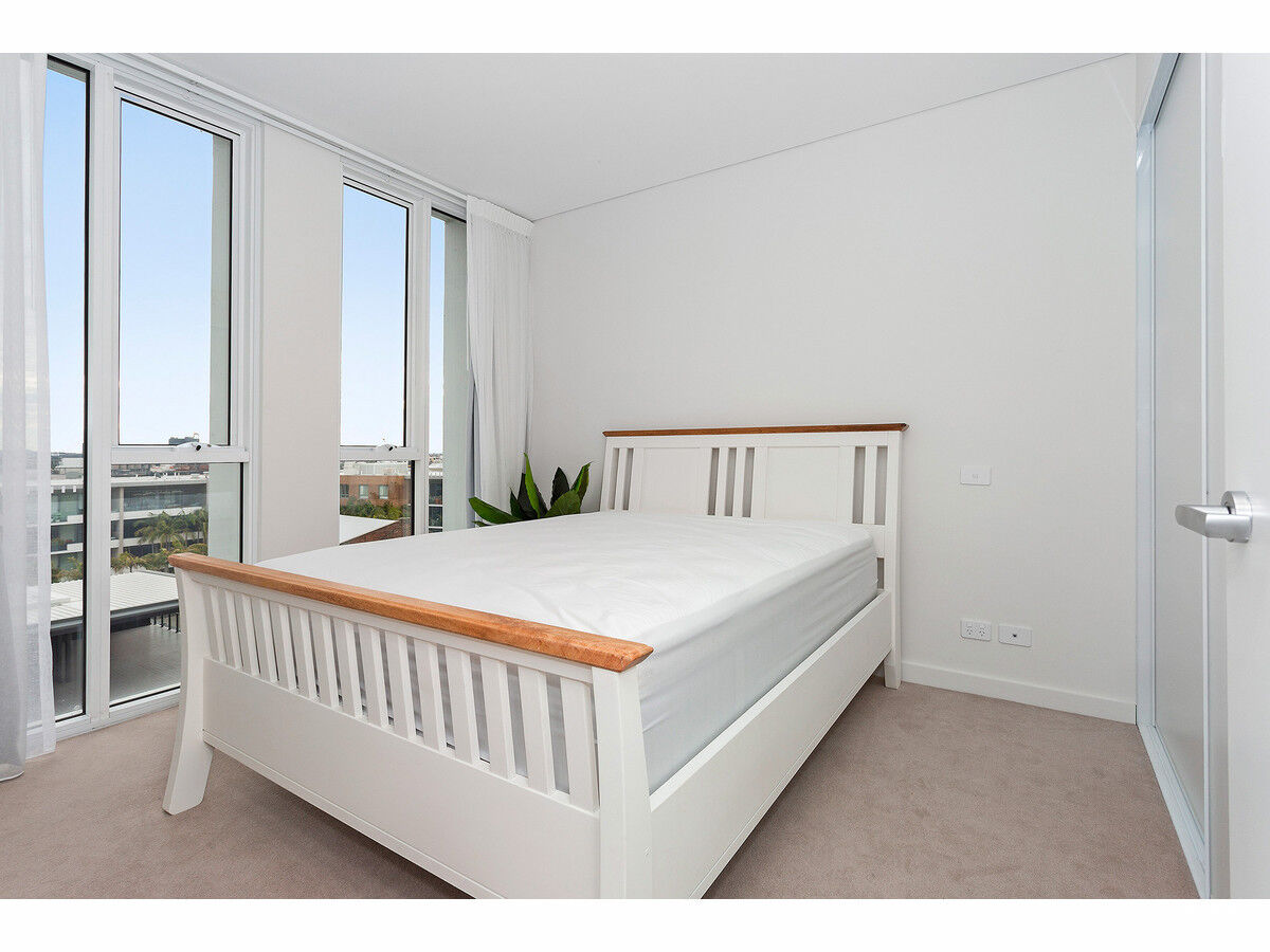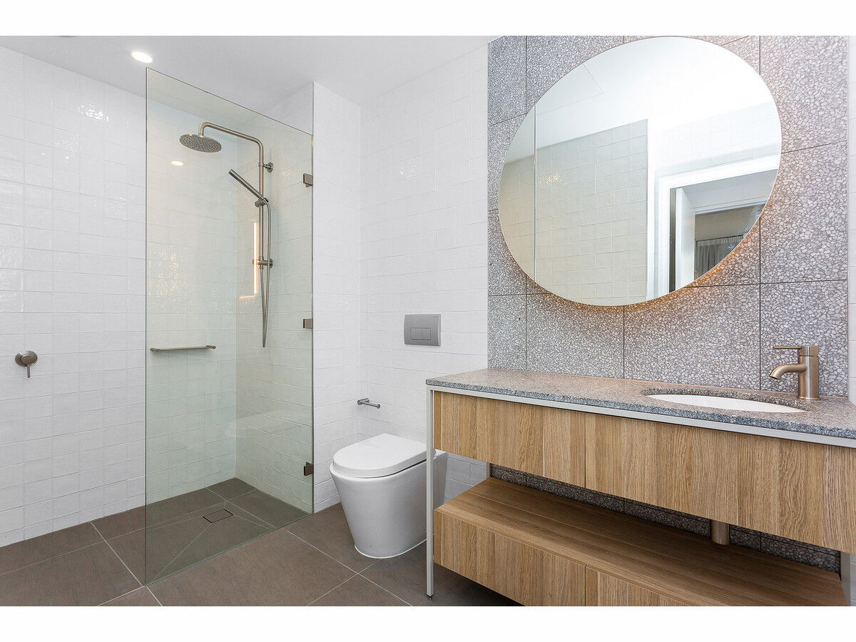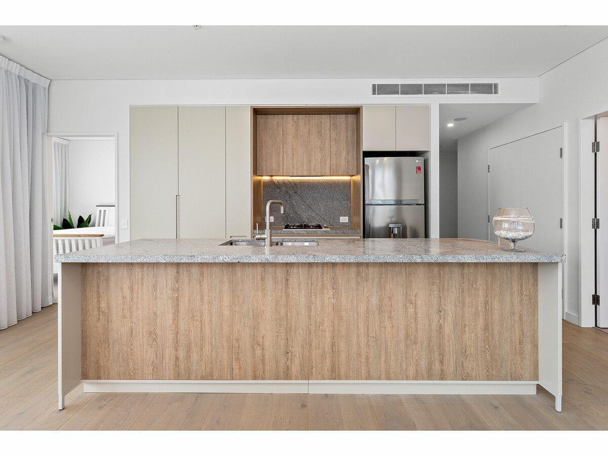 Open-plan living and dining attracts natural light, as the location is perched high in the building with a coveted corner location. Complemented by a stone-finished kitchen with quality appliances and in built fridge design. Instantly shift into relaxation mode on an alfresco balcony with an opportunity to entertain family and friends against a backdrop of the neighbouring skyline. Two robed bedrooms are serviced by a pair of fully tiled shower bathrooms.