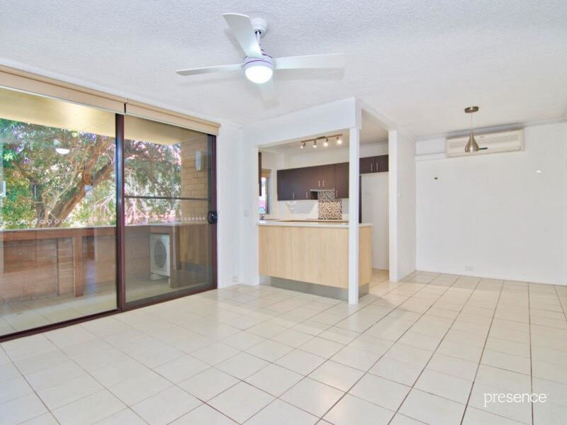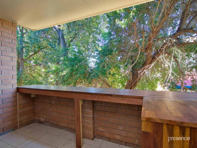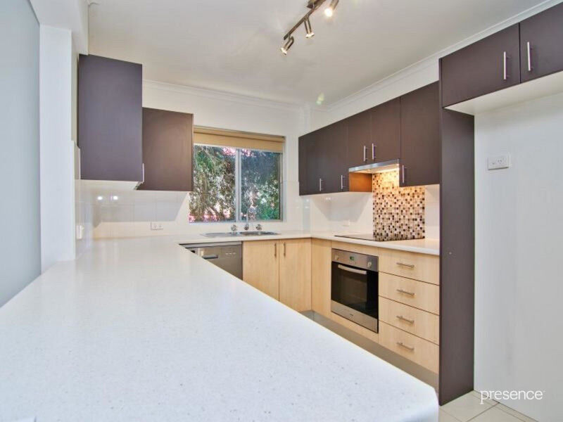 An open plan layout incorporates a contemporary kitchen, separate dining space and bright lounge area where glass aspects extend onto an alfresco balcony with modern bar seating complemented by leafy vistas. Private accommodation is provided by two robed bedrooms further enhanced by a large central bathroom.