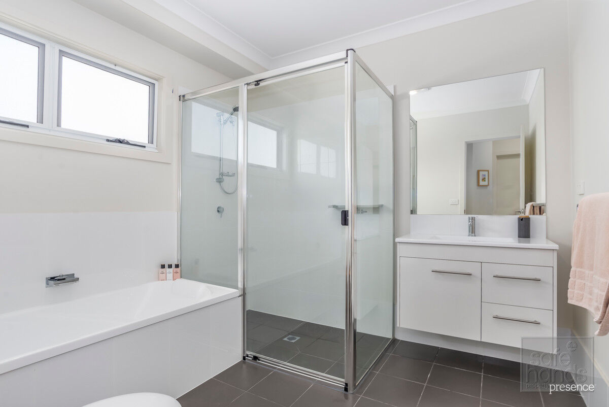 The lounge room flows on from the kitchen and is complimented by a study nook and a ceiling fan. Down the hallway we have an over sized bathroom complete with separate bath tub, shower, vanity and W/C. Just outside the bathroom is another handy separate toilet and a large linen cupboard.