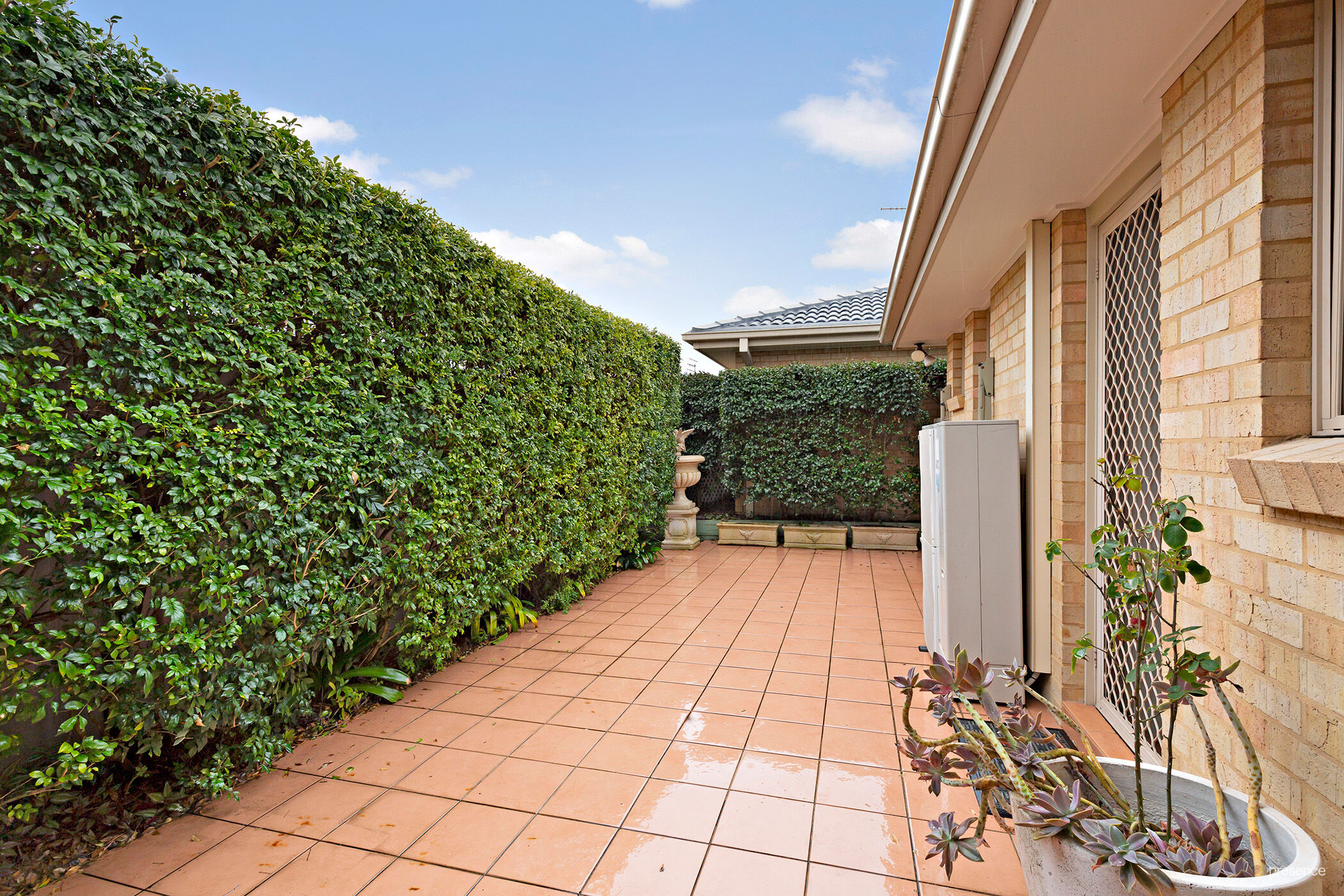 The private paved courtyard, framed by a leafy backdrop, provides a peaceful haven for outdoor living or casual entertaining.
